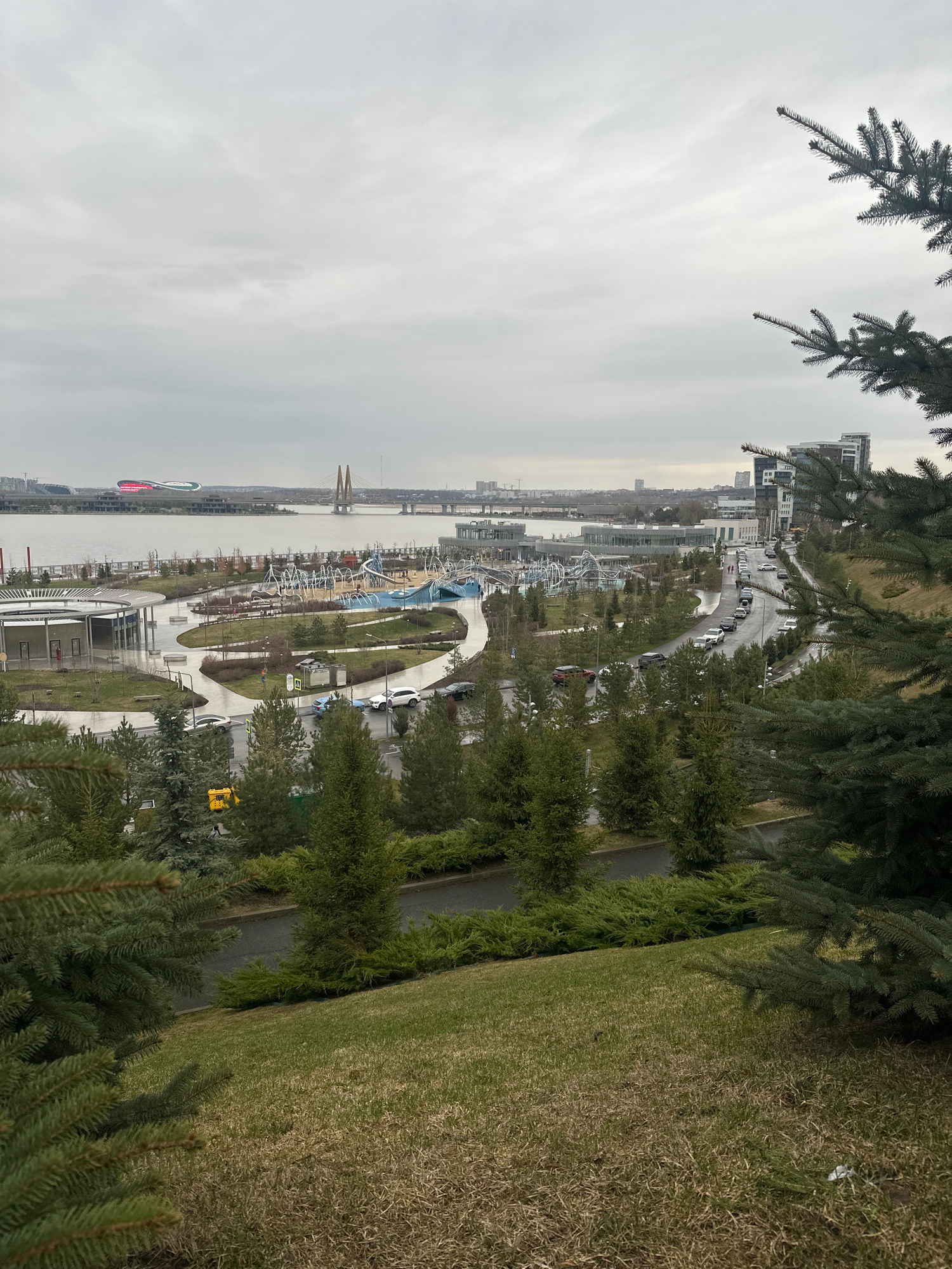 The image depicts a panoramic view of Kazan, Russia, overlooking the Kazanka River and its surrounding urban landscape. From an elevated vantage point, possibly a hillside park, the foreground is domi…read more