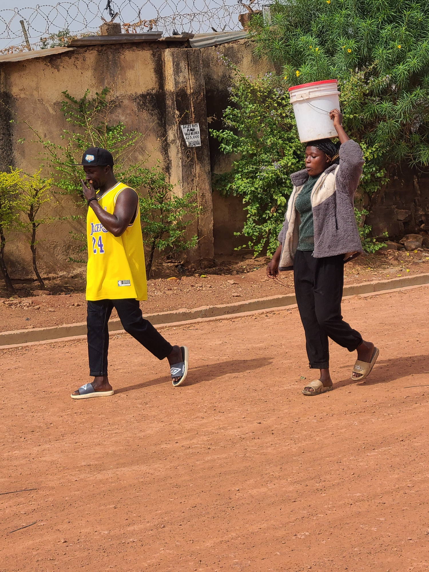This outdoor image, taken in Jos, Nigeria, depicts two individuals on a reddish-brown dirt road under bright daylight. In the foreground on the left, a person, likely female, walks with a white plast…read more