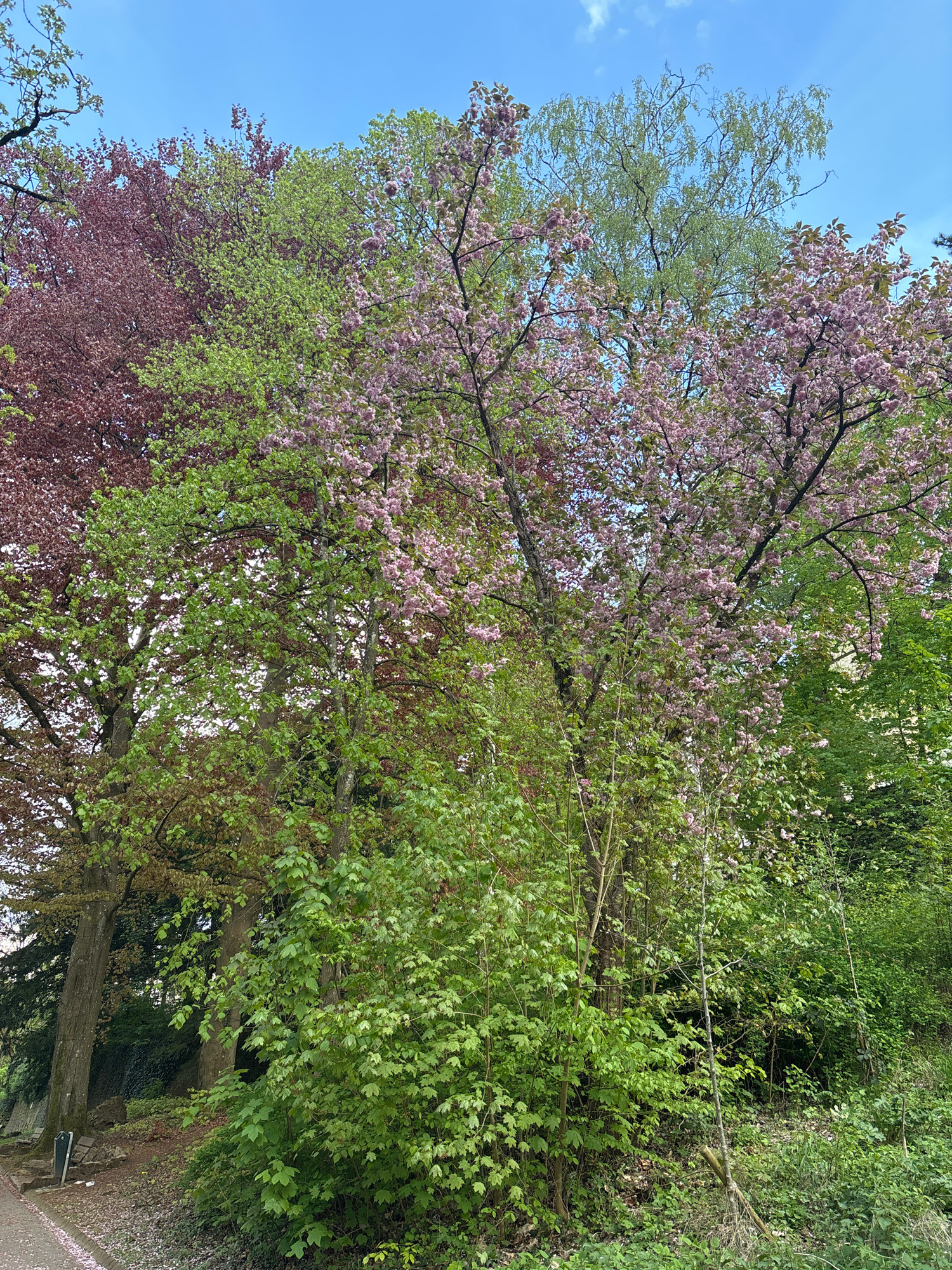 The image captures a view of trees in what appears to be a park or garden setting in the city of Luxembourg, Luxembourg. The trees display a variety of colors, with some exhibiting green foliage, othe…read more