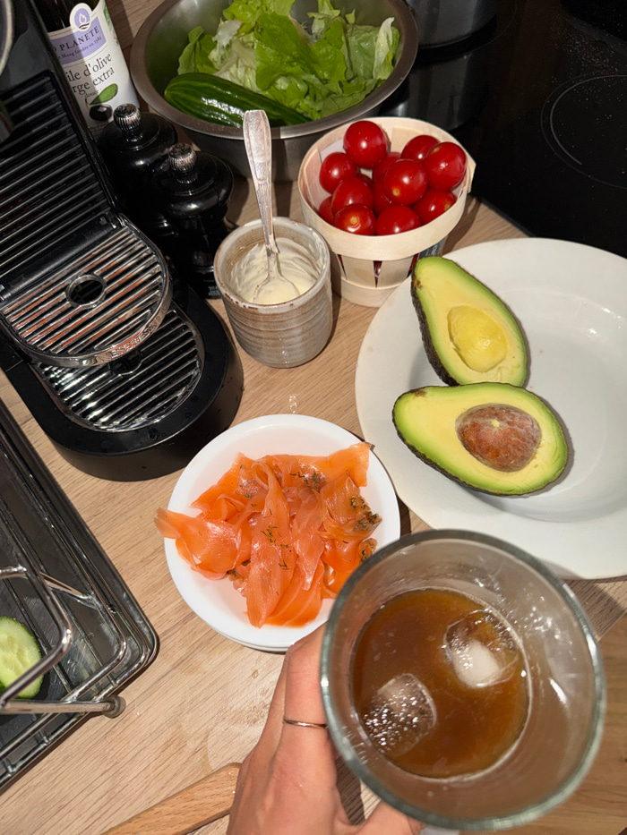 The scene captures a close-up, overhead view of a kitchen countertop in the city of Lyon, France, arranged with various food items and kitchenware. On the upper left, a bottle of "Huile d'olive Vierge…read more