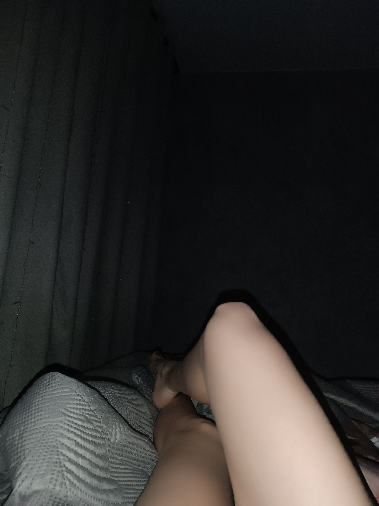 A close-up shot of legs resting on a bed with a grey quilted blanket. The location appears to be indoors, possibly a bedroom, with dark curtains visible in the background. The city is unknown.