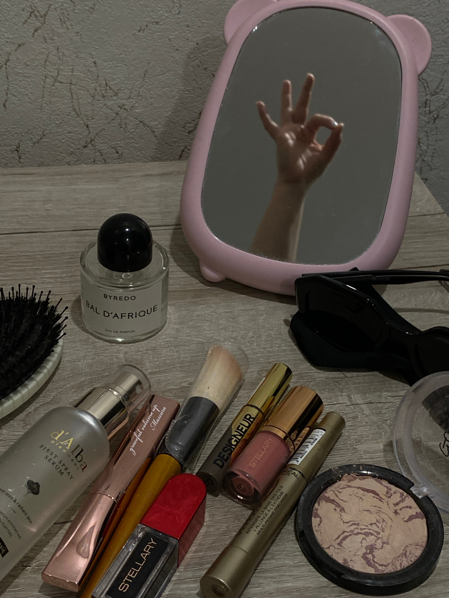 The image captures a flat lay of various personal care and cosmetic products arranged on a light wooden surface, possibly a vanity or table. In the upper left quadrant, a pink, oval mirror with what a…read more