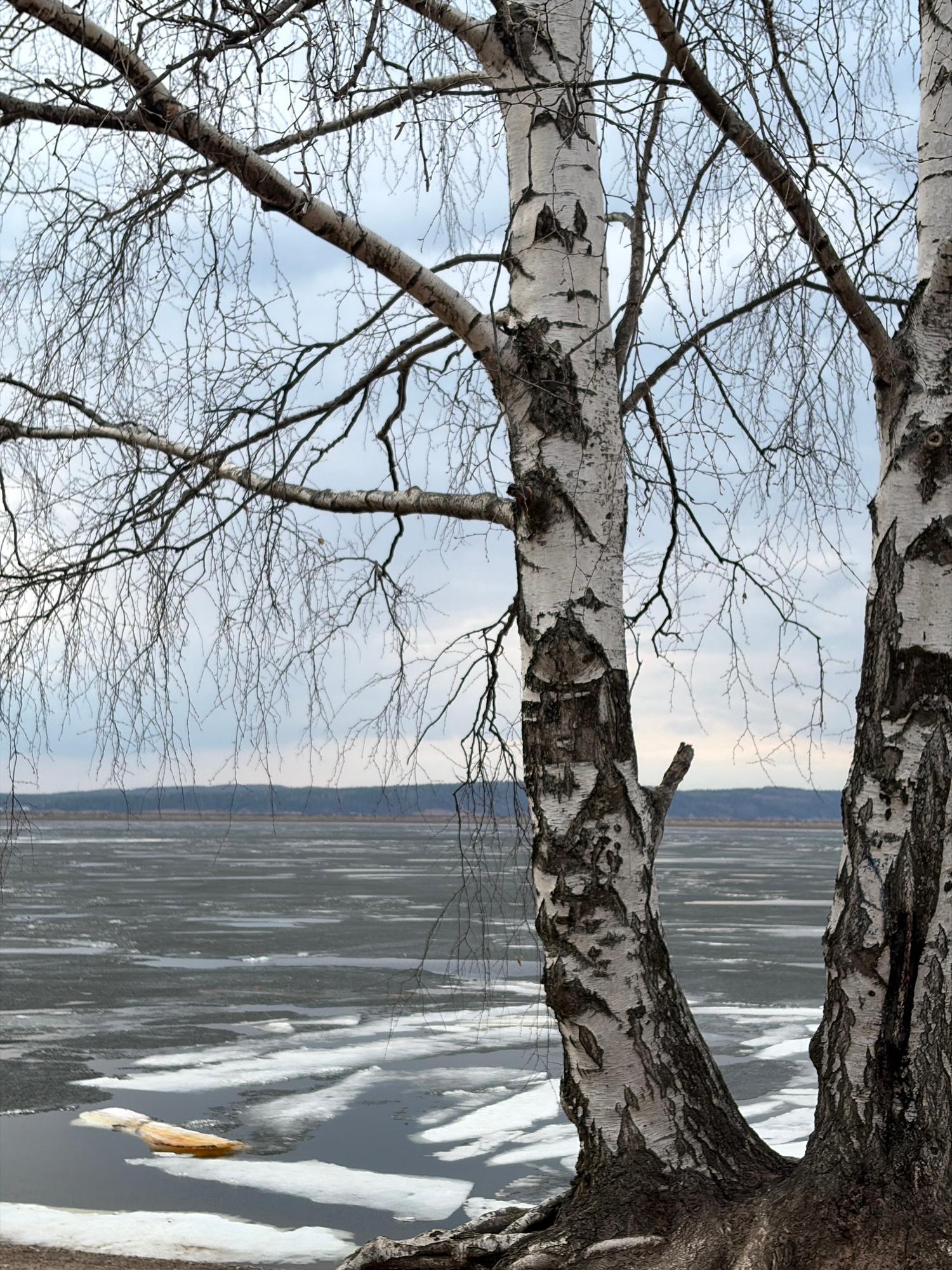 The image shows a winter scene taken in Chaikovsky, Russia. Two birch tree branches frame the sky and a frozen body of water. The branches are bare, indicating winter. The water surface has ice and sn…read more