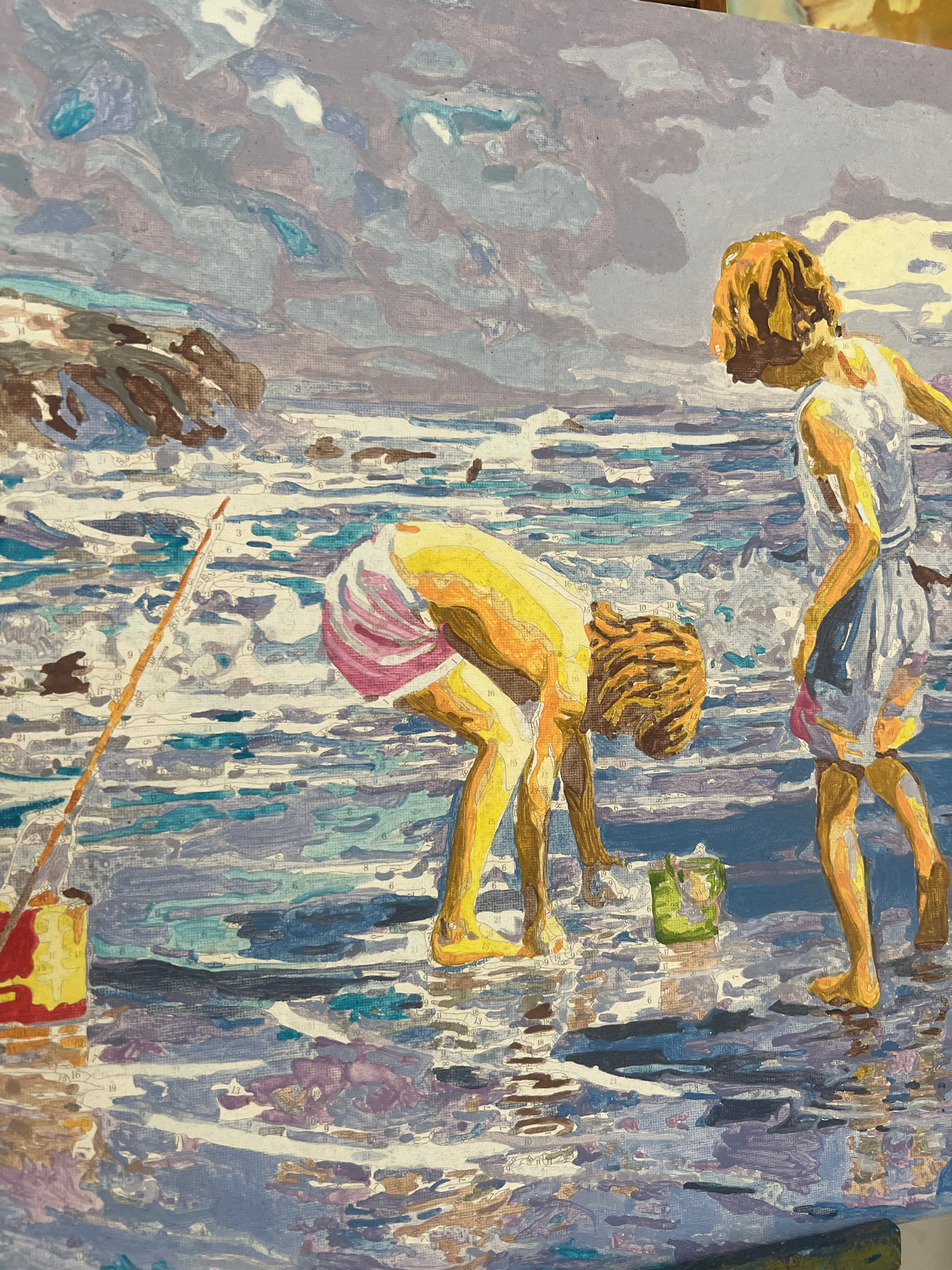 The image is a painting on canvas depicting two figures near what appears to be a waterfall. The upper figure is lying down, seemingly suspended in the air, and wearing a white garment with a pink acc…read more