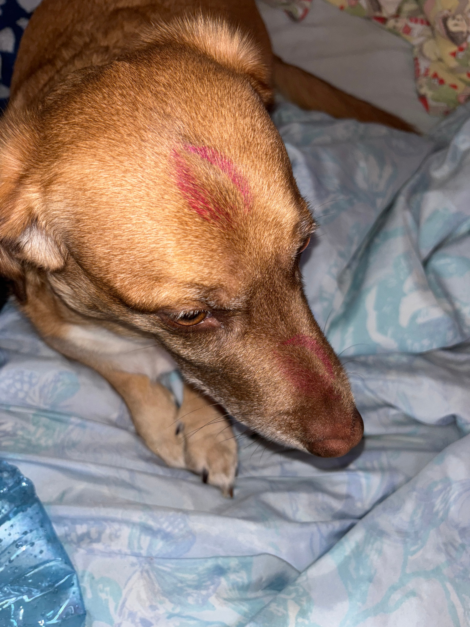 The image shows a close-up of a brown dog lying on a bed with blue and white patterned sheets. The dog has two red lipstick marks on its fur, one on its head and one on its snout. A paw is visible nea…read more