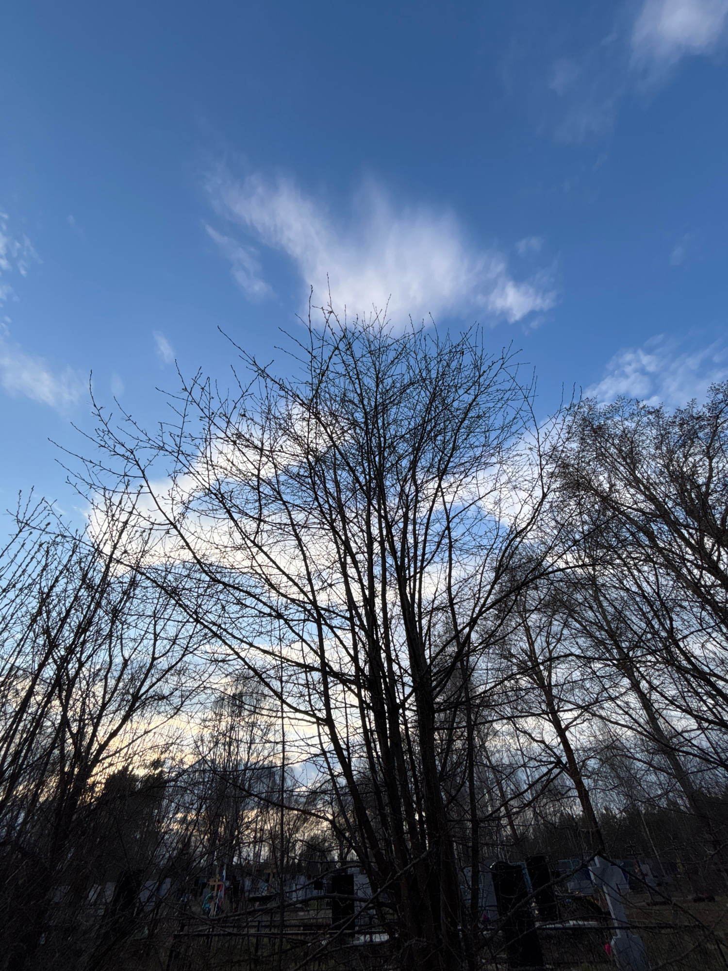 The image shows a view looking up into a bright blue sky with scattered white clouds, framed by the bare branches of trees. The trees' dark silhouettes contrast with the brightness of the sky. A porti…read more