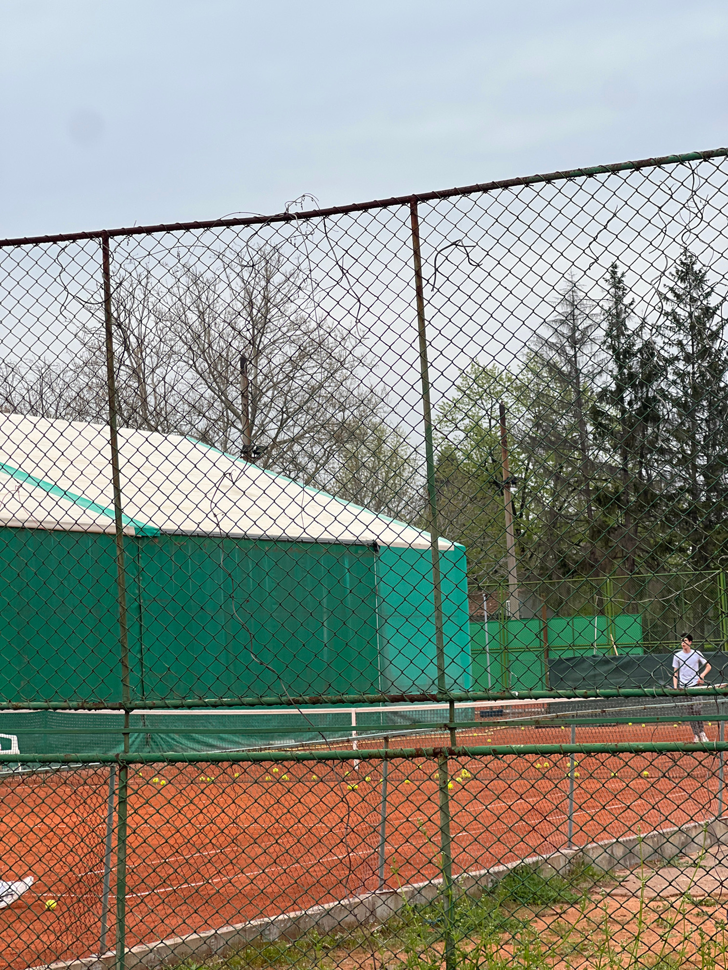 An elevated view through a chain-link fence captures a clay tennis court on an overcast day. The fence, appearing in the immediate foreground, features a grid pattern with some sections painted greenβ¦read more