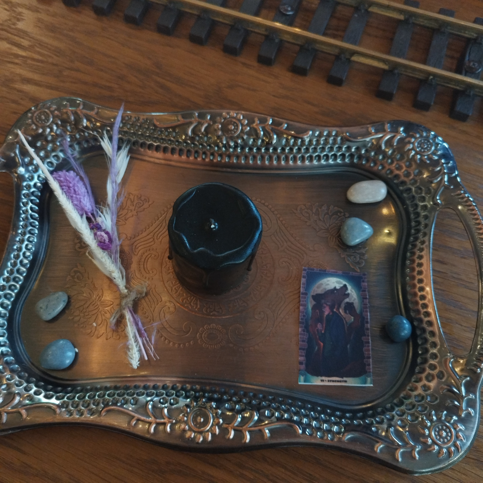 An overhead shot displays a still life arrangement on an ornate, metallic tray with a tarnished silver or bronze finish and intricate embossed patterns. The tray rests on a wooden surface, likely a ta…read more