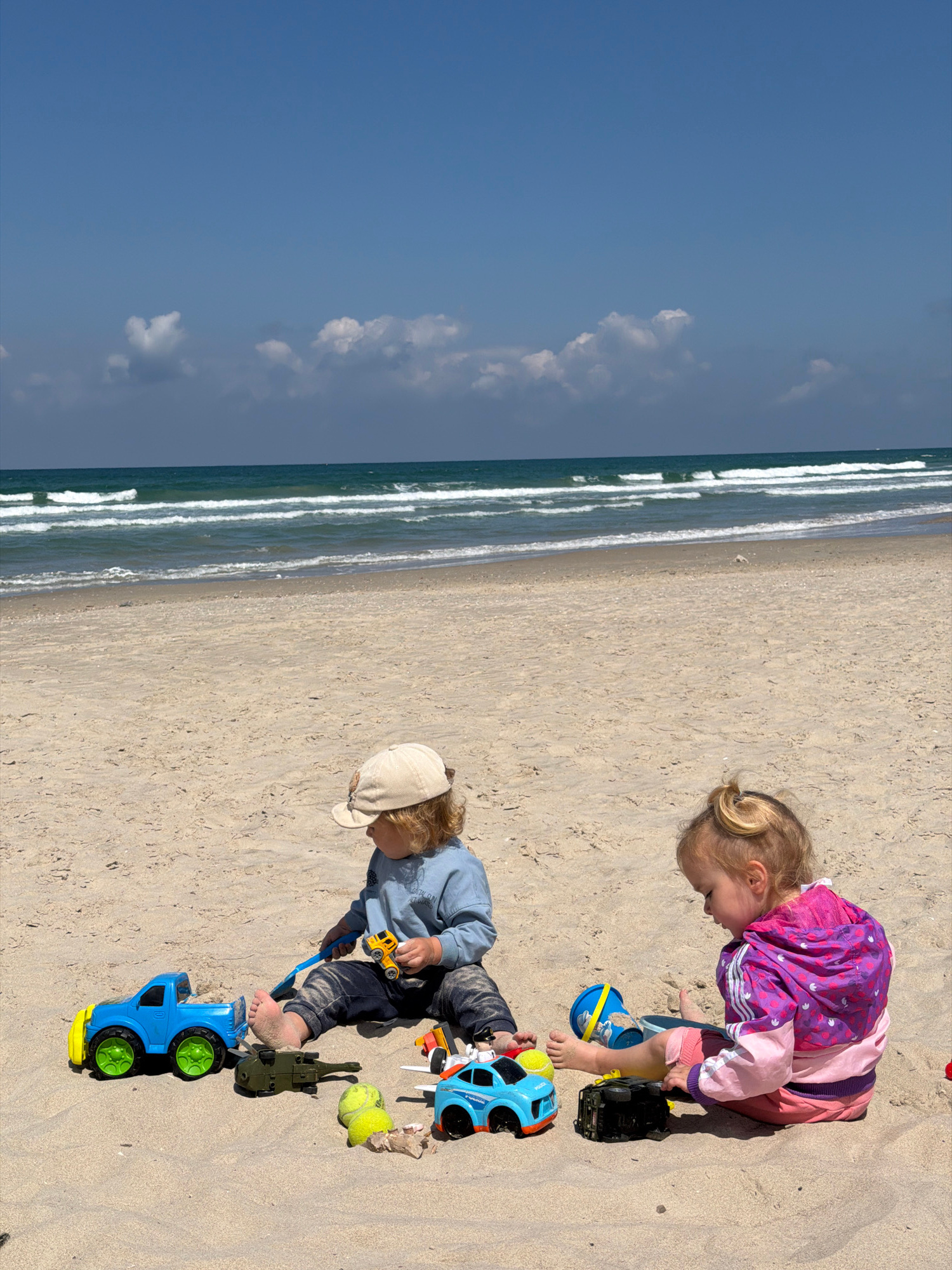 Two young children are playing on a sandy beach with various toys. One child, wearing a pink and purple jacket, is kneeling and looking at a blue bucket. The other child, wearing a light blue shirt an…read more