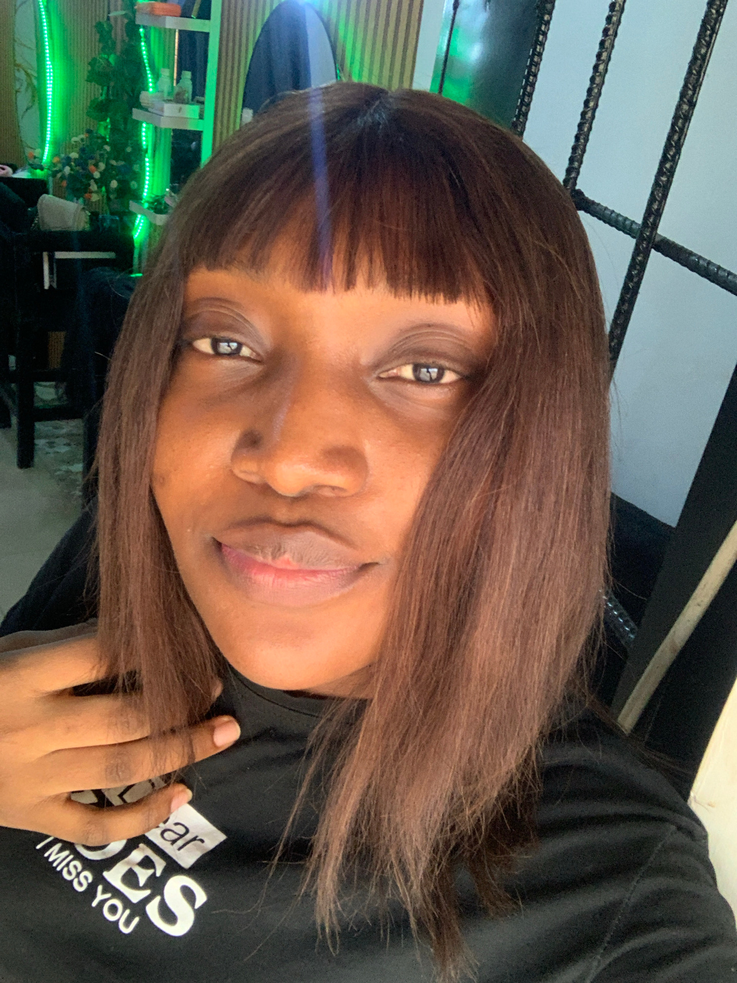 A close-up, selfie-style shot features a woman with dark hair and bangs. She is wearing a black t-shirt with white text, part of which is visible: "...ear...ODES...I MISS YOU." Her hand is near her ne…read more