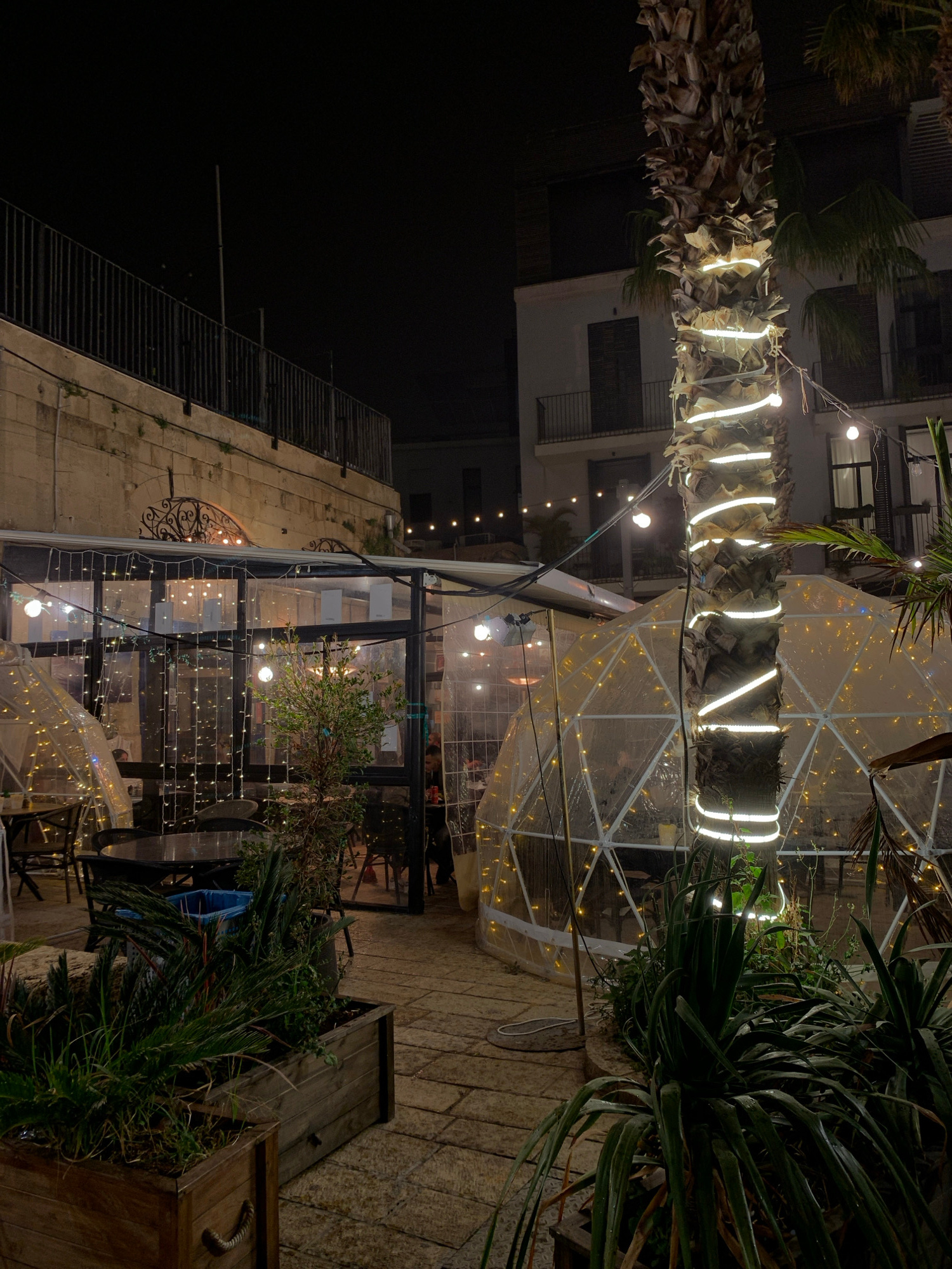 The image depicts an outdoor dining area at night, possibly in Tel Aviv, Israel. The scene is lit with string lights and spotlights, illuminating a palm tree wrapped with lights. A geodesic dome-shape…read more