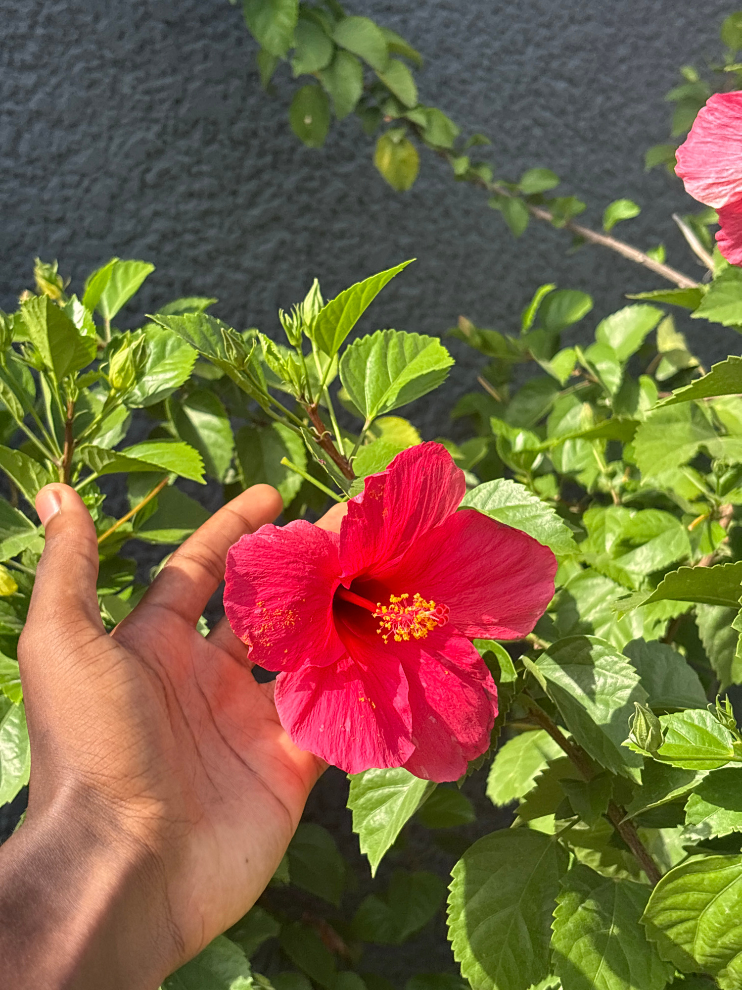 The image depicts a hand gently supporting a vibrant red hibiscus flower, which is part of a plant with green leaves. The background features more foliage and a grey wall or surface. The scene is litβ¦read more