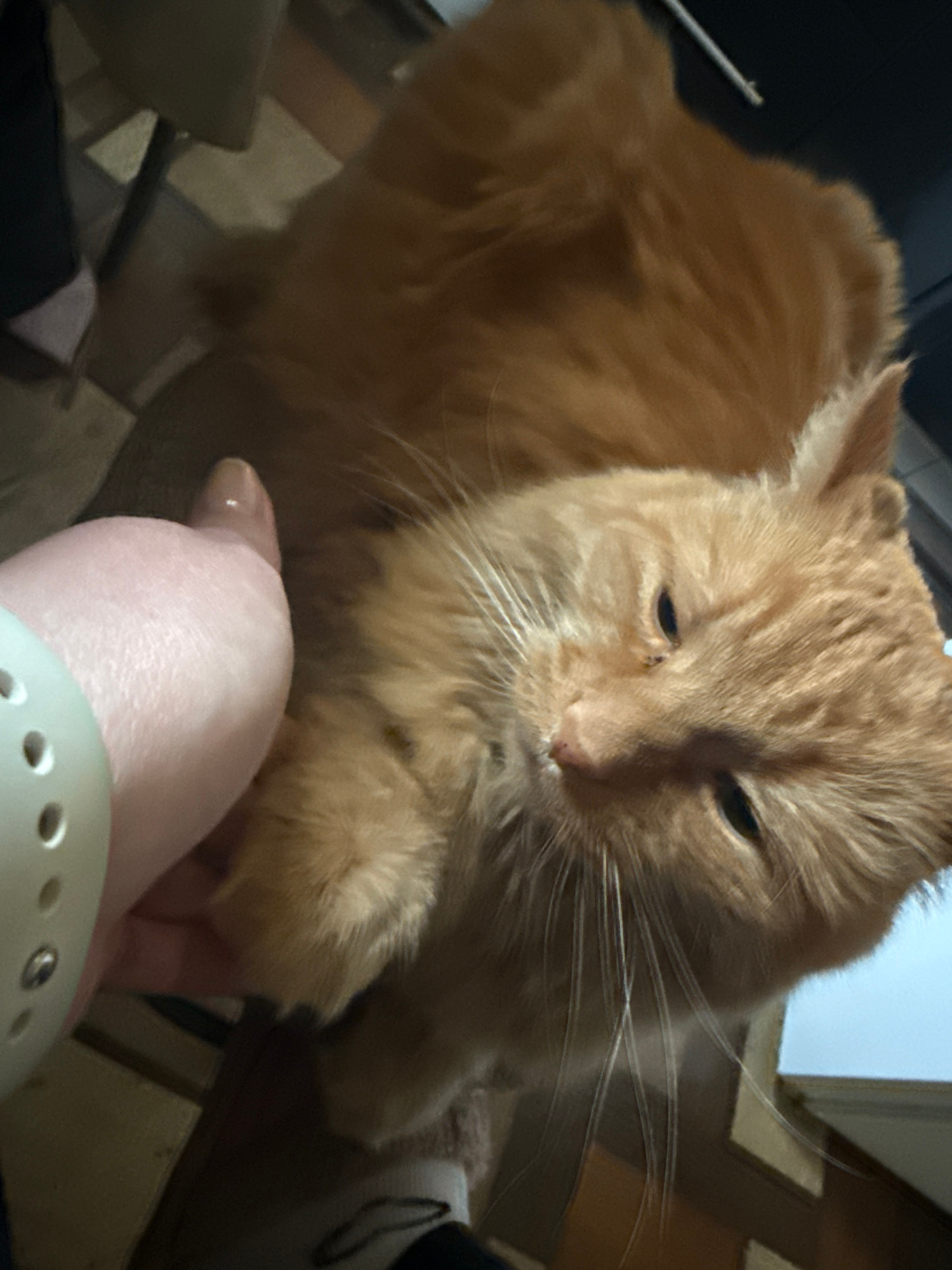 A fluffy, orange tabby cat rests on a person's hand. The person is wearing a light green or white watch band with holes. The cat appears relaxed, with its eyes partially closed. The background include…read more