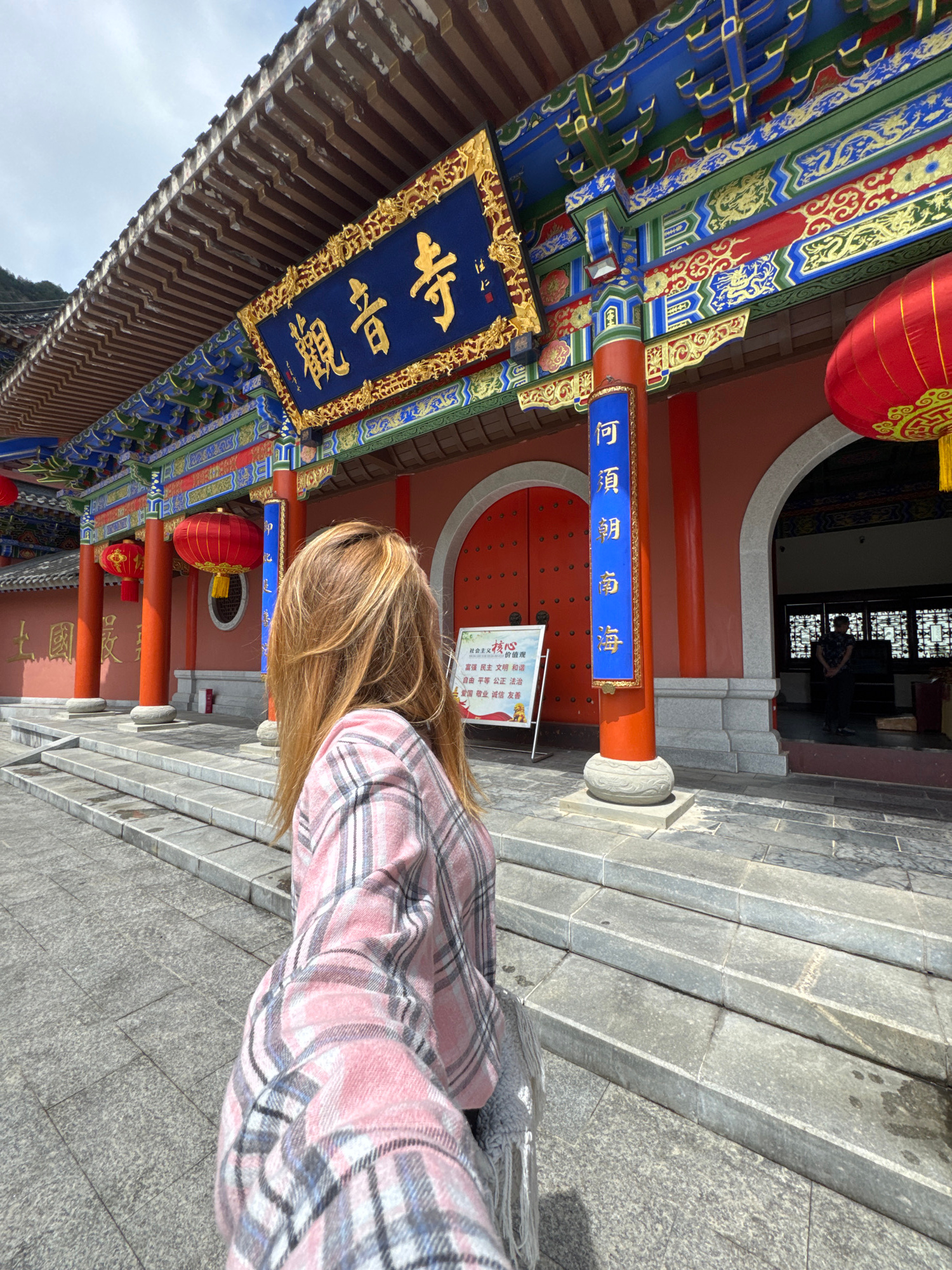 The image shows a woman with blonde hair, wearing a pink and gray plaid shirt, standing on a stone staircase in front of a traditional Chinese building. The building has ornate decorations with vibran…read more