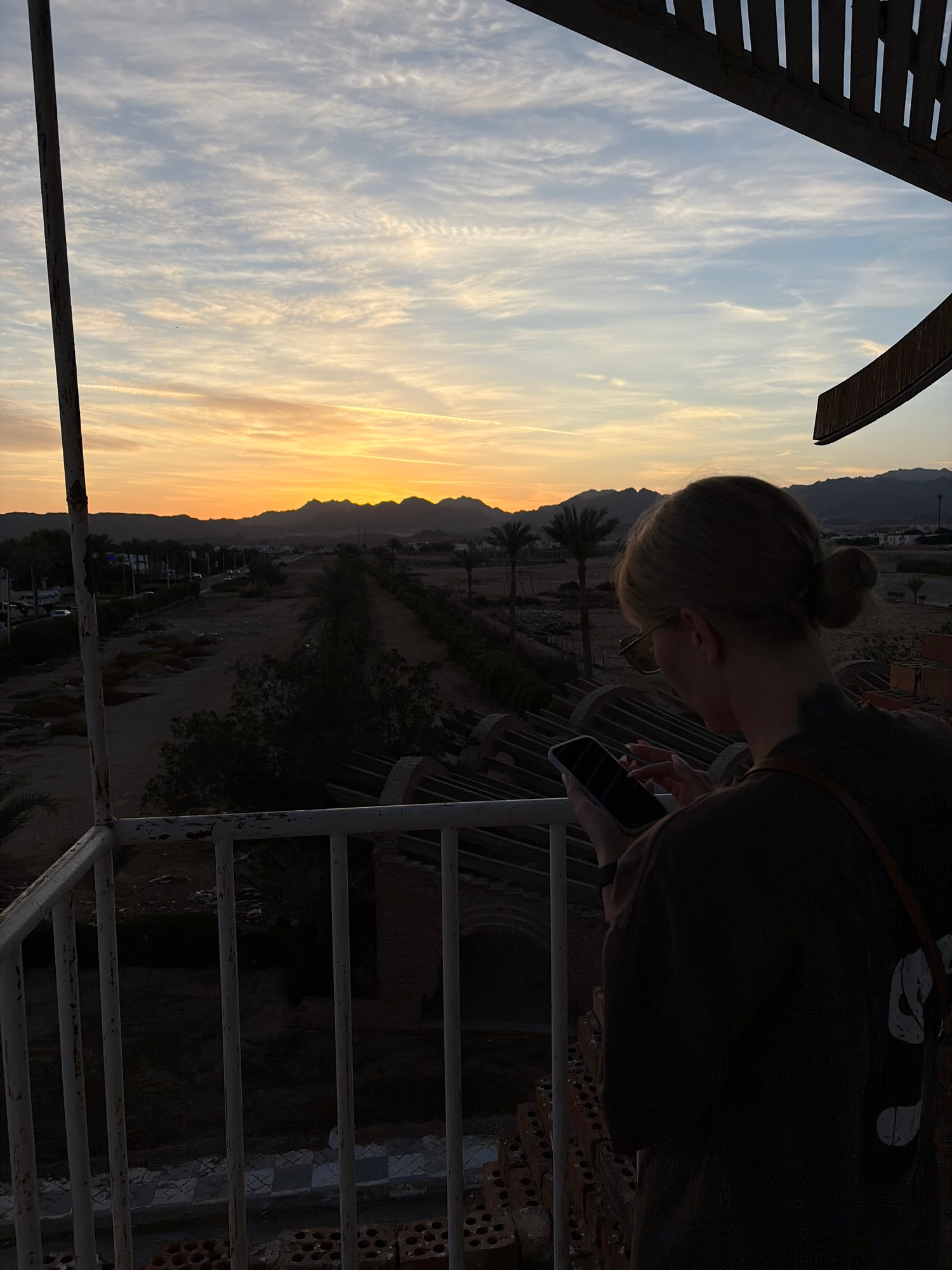 A medium shot depicts a person holding a mobile phone, standing on a balcony overlooking a landscape at sunset in Sharm El Sheikh, Egypt. The person, presumably female, has blonde hair in a bun, wear…read more