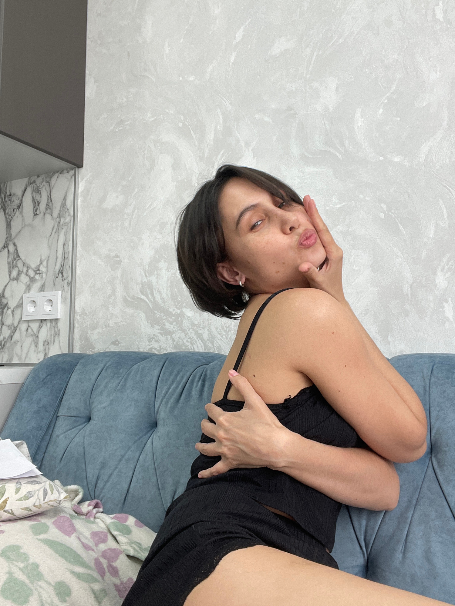 A young woman with short dark hair is reclining on a light blue sofa or armchair, with a white patterned blanket partially visible on the right side of the frame. She is wearing a black sleeveless top…read more