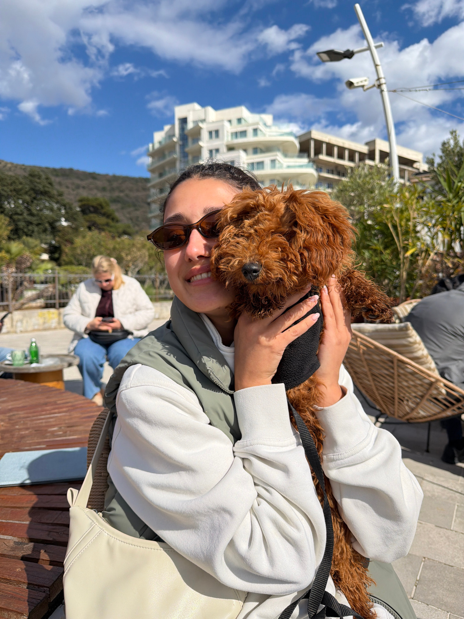 A photograph taken in Petrovac centar, Montenegro shows a young woman holding a brown poodle. The woman is wearing sunglasses, a white sweatshirt, and a green vest. She is seated at a wooden table. In…read more