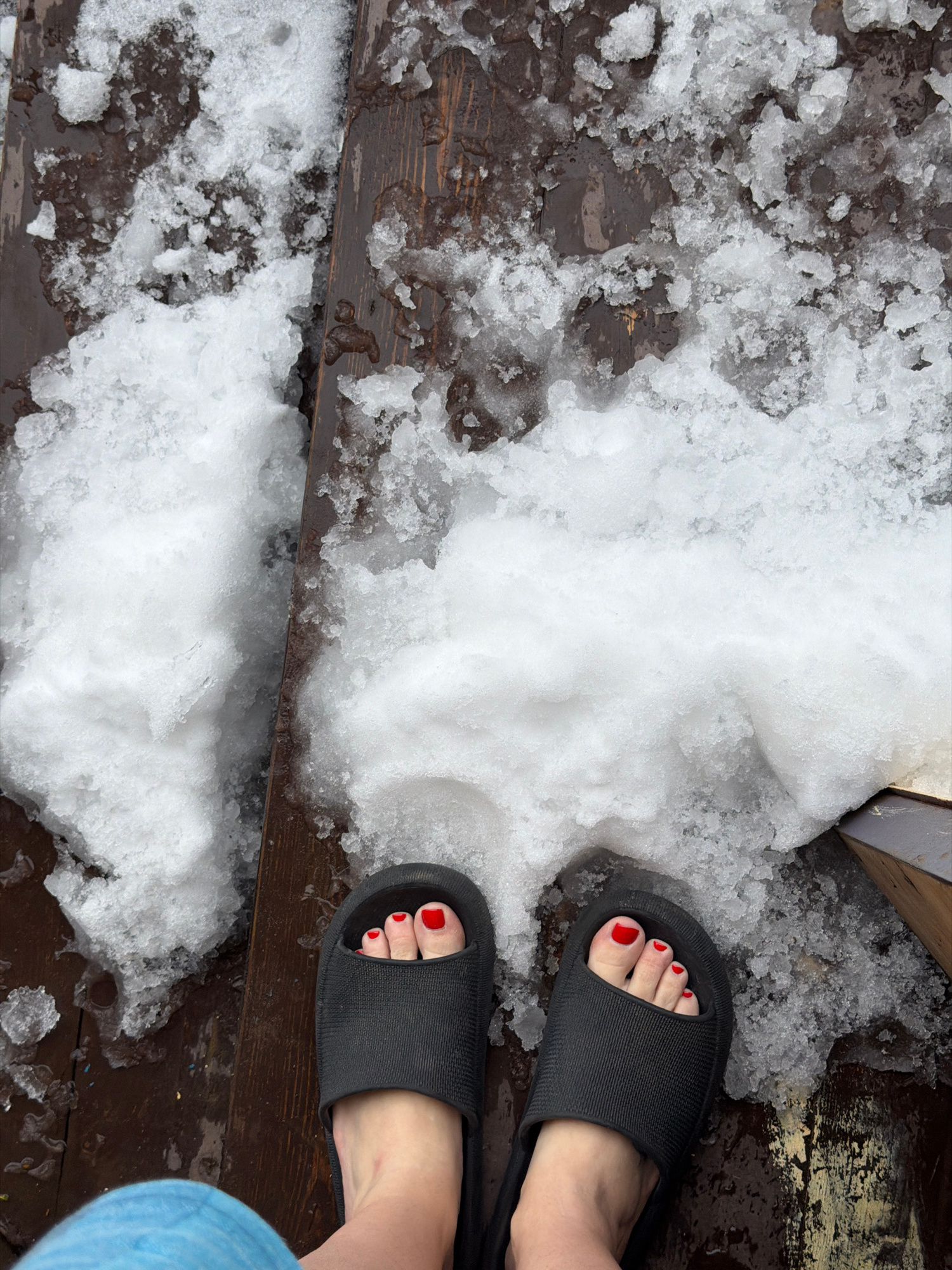 A view from above shows snow and a pair of black sandals with red toenails on a wooden deck. Some of the snow appears to be melting. The image was captured in Chaikovsky, Russia.
