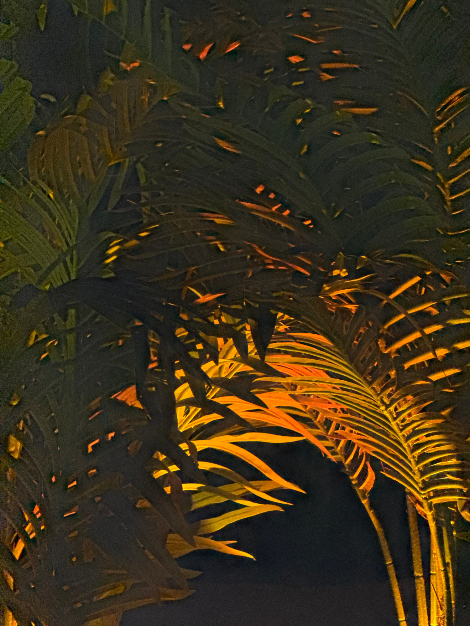 The image shows a close-up view of tropical plants, likely palm fronds, illuminated by a warm, orange light source at night. The plants are densely packed and overlap each other, creating a complex pa…read more