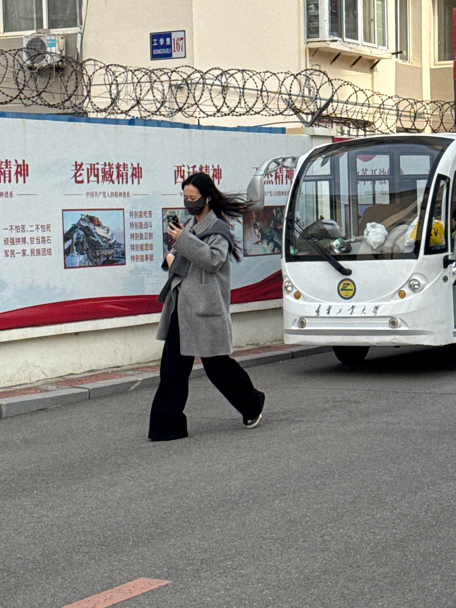 A street scene in what appears to be Zhongtun, China. A woman with long dark hair, wearing a gray coat and black pants, walks past a large poster on a building with razor wire. The poster has Chinese…read more