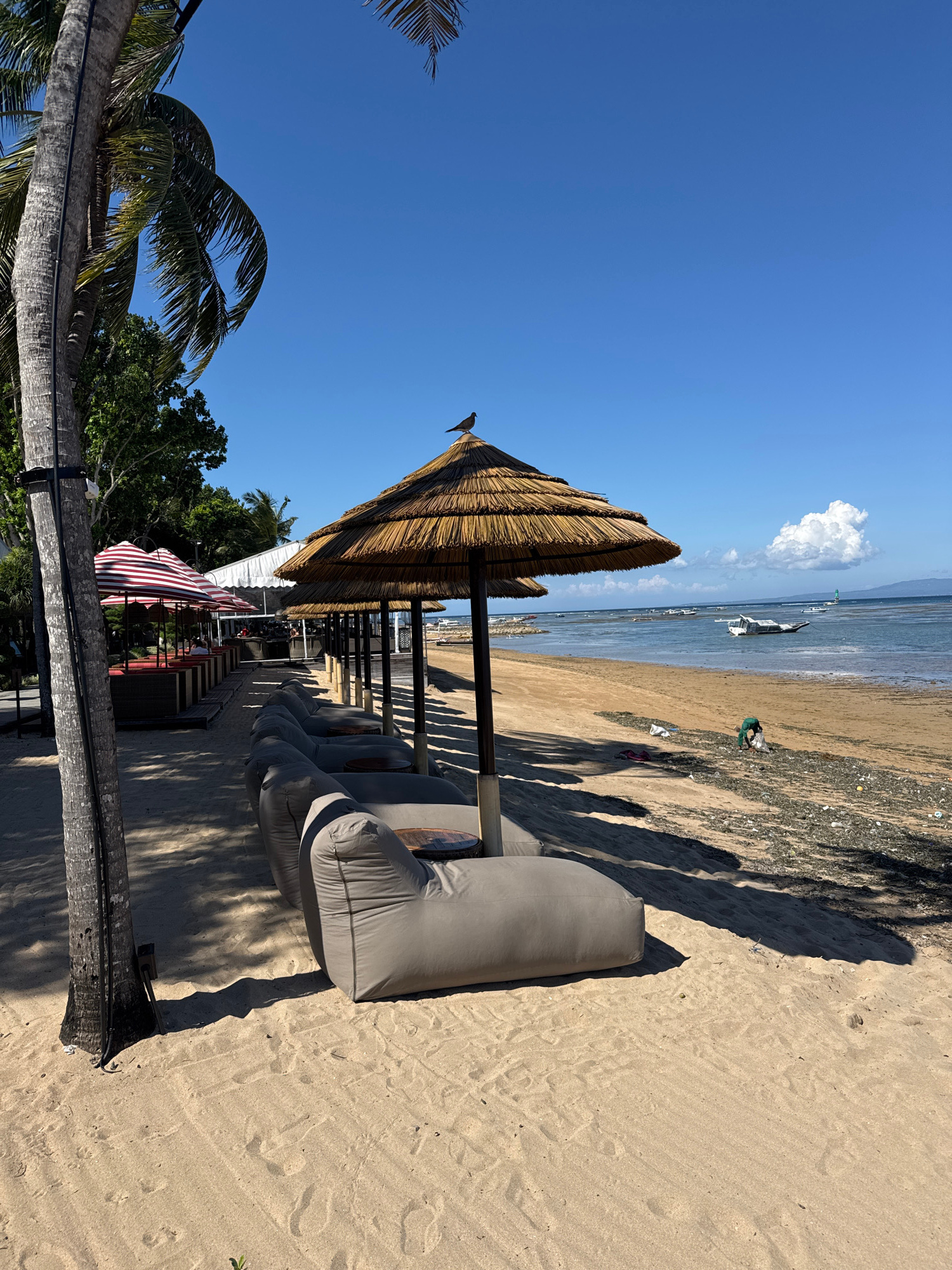 The image depicts a vibrant, sunny beach scene, likely from a resort or beach club in Denpasar, Indonesia. The perspective is from the sandy shore, looking out towards the ocean. In the foreground, a…read more