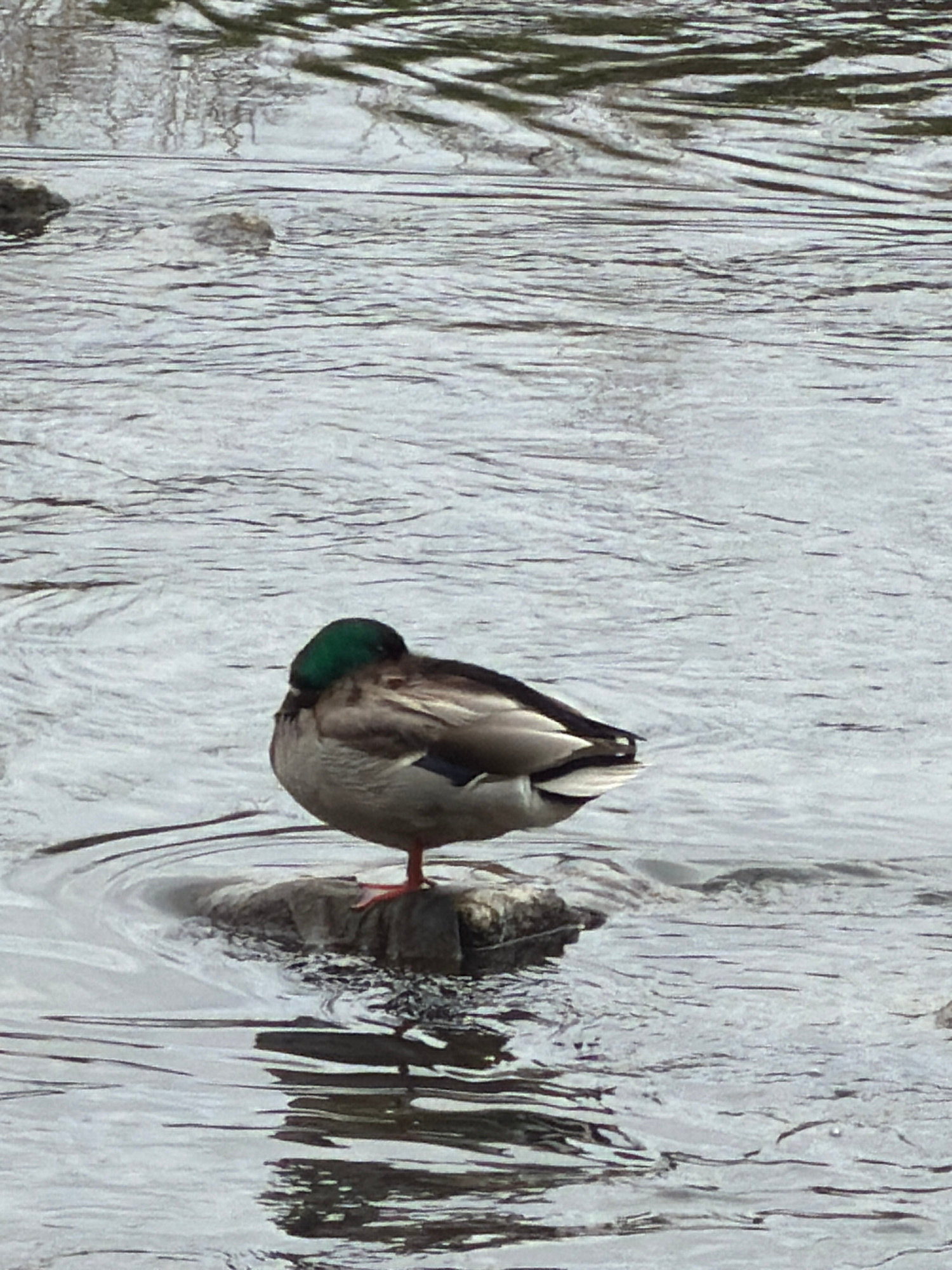A mallard duck perches on a log in the water. The duck has its head tucked under its wing. The water is partially frozen. The location is likely in Esch-sur-Alzette, Luxembourg.