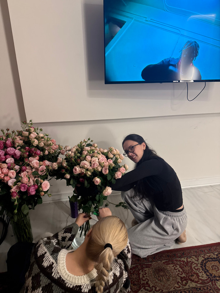 Two women arrange large bouquets of pink and light pink roses. One woman with dark hair and glasses kneels beside the flowers, smiling at the camera. The other, with blonde hair in a braid, focuses on…read more