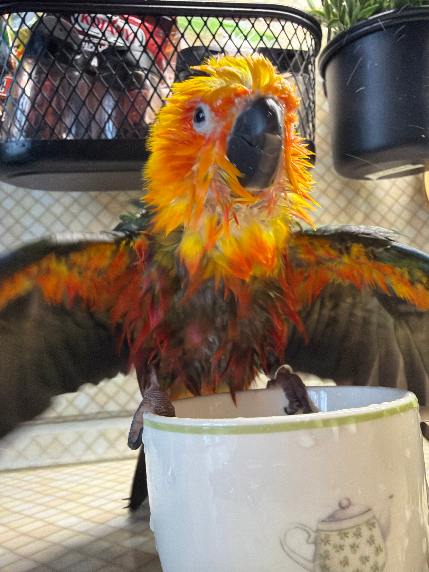 A close-up shot depicts a sun conure clinging to a white mug with a tea cup design on it. The bird has wet plumage, predominantly orange and yellow on the head and darker, multicolored feathers on the…read more