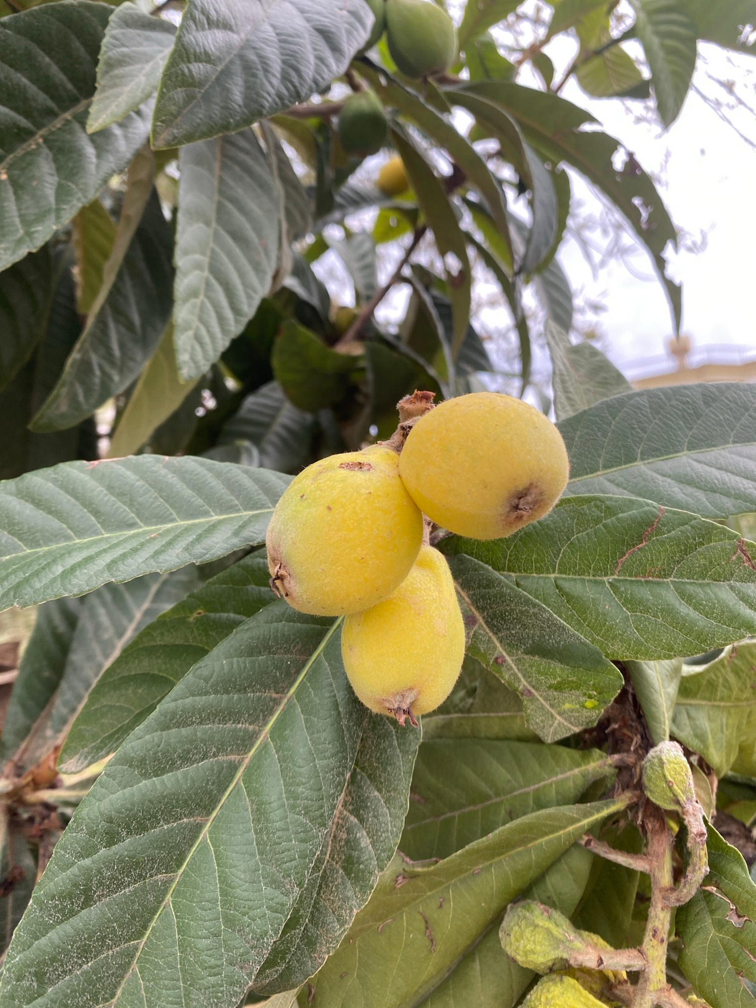 The image shows a close-up of a loquat tree branch with ripe, yellow-colored loquat fruits. The tree is characterized by large, green, textured leaves. Some immature green loquats are also visible. It…read more