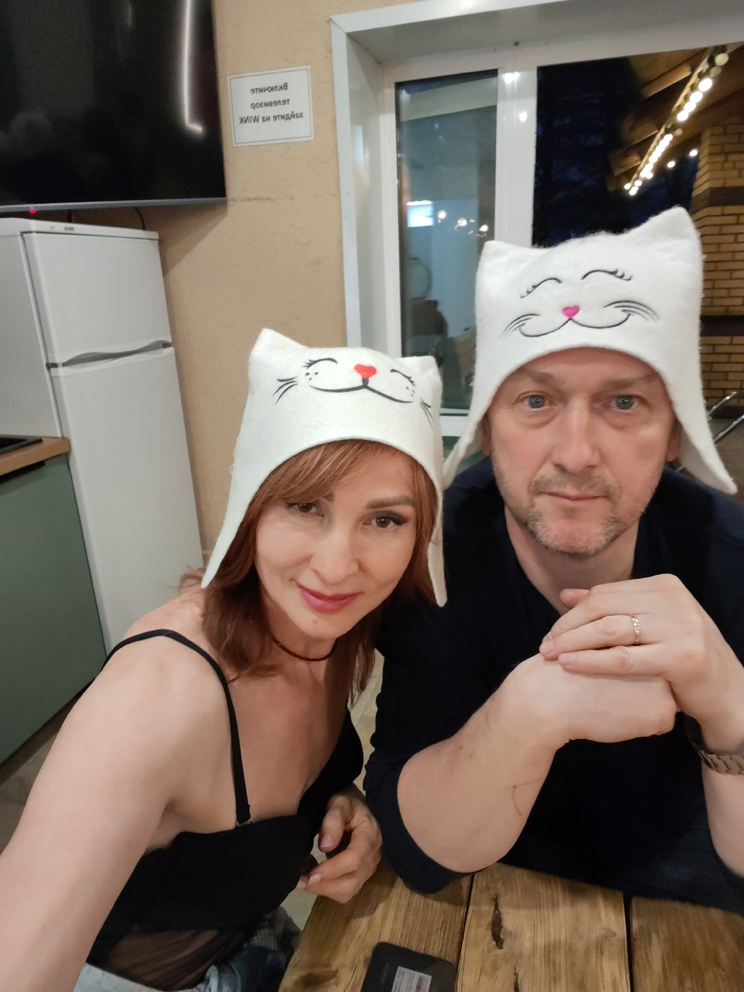 In the city of Chaikovsky, Russia, a photograph captures a middle-aged woman and man sitting at a wooden table. Both are wearing white, cat-shaped hats with drawn-on faces, featuring hearts for noses.…read more