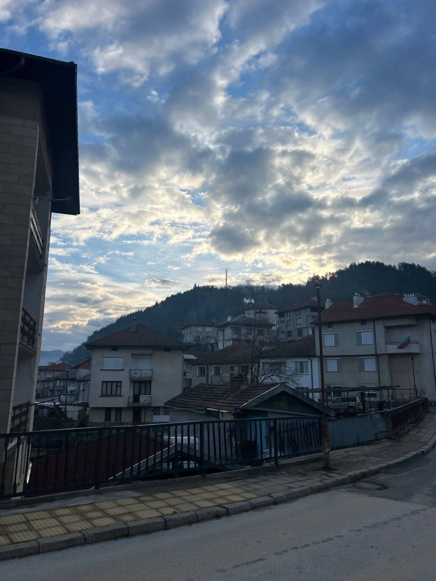 The image shows a view of Zlatograd, Bulgaria, from a slightly elevated perspective. The sky is filled with dramatic, partly cloudy formations, with hints of sunlight filtering through. Below the sky,…read more