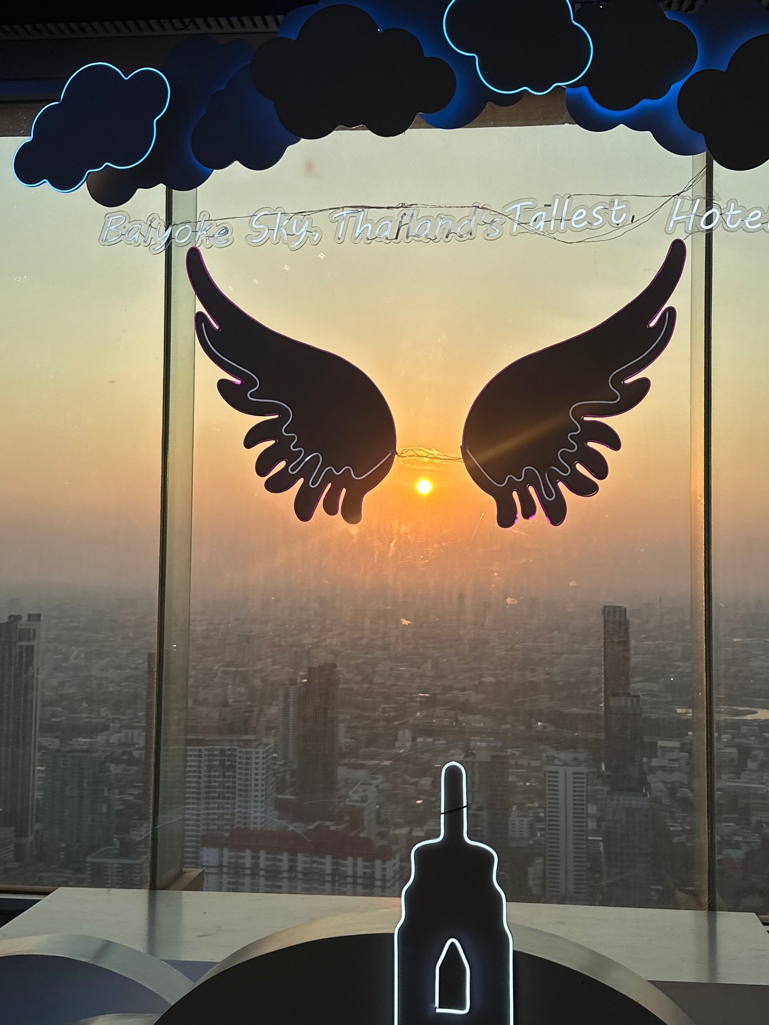 The image depicts a view from the Baiyoke Sky Hotel, Thailand's tallest hotel, in Bangkok. The view is seen through a glass window featuring neon decorations of clouds and angel wings. The sun is sett…read more