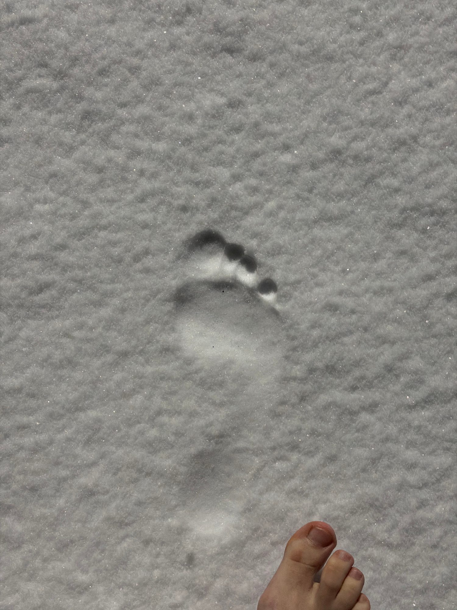 A close-up, overhead shot shows a patch of snow with a barefoot footprint in the center and the toes of the same foot visible in the upper right corner. The snow appears to be granular. The location a…read more