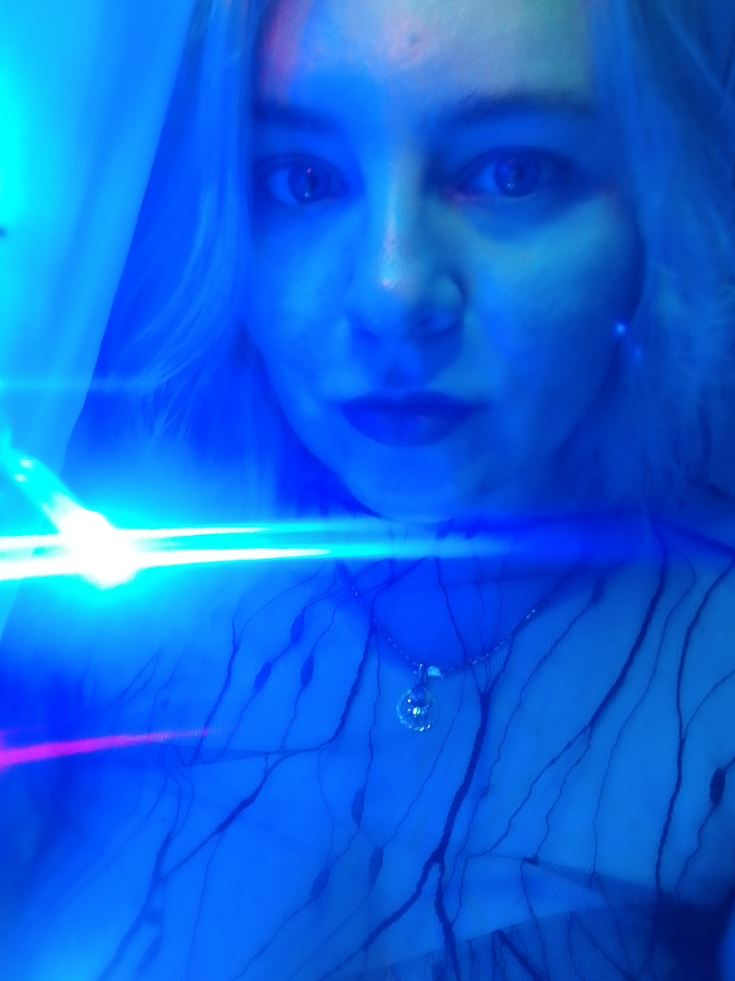 A close-up portrait of a fair-skinned person with light hair illuminated by bright blue light, creating a stark contrast. The person is wearing a dark-colored top with a patterned texture. A silver neβ¦read more