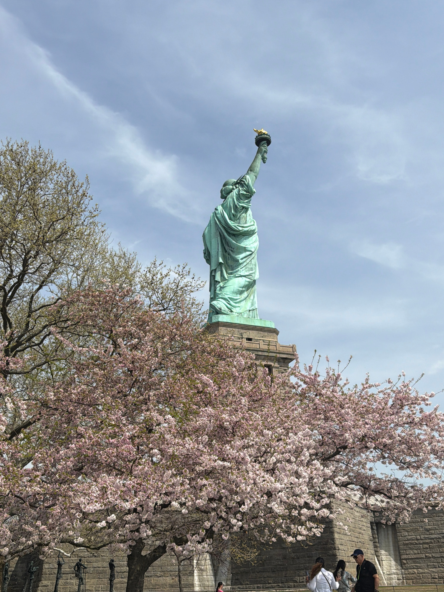This outdoor, vertically oriented image captures a unique perspective of the Statue of Liberty, situated in New York, United States of America. The iconic statue, distinguished by its weathered green-…read more