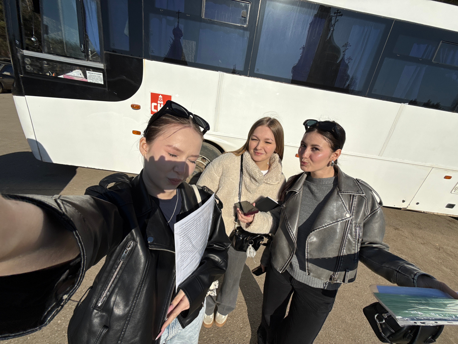 The image, taken in bright daylight, shows three young women standing outdoors next to a white and black bus on a paved surface, likely concrete or asphalt. All three women wear dark-colored faux leat…read more