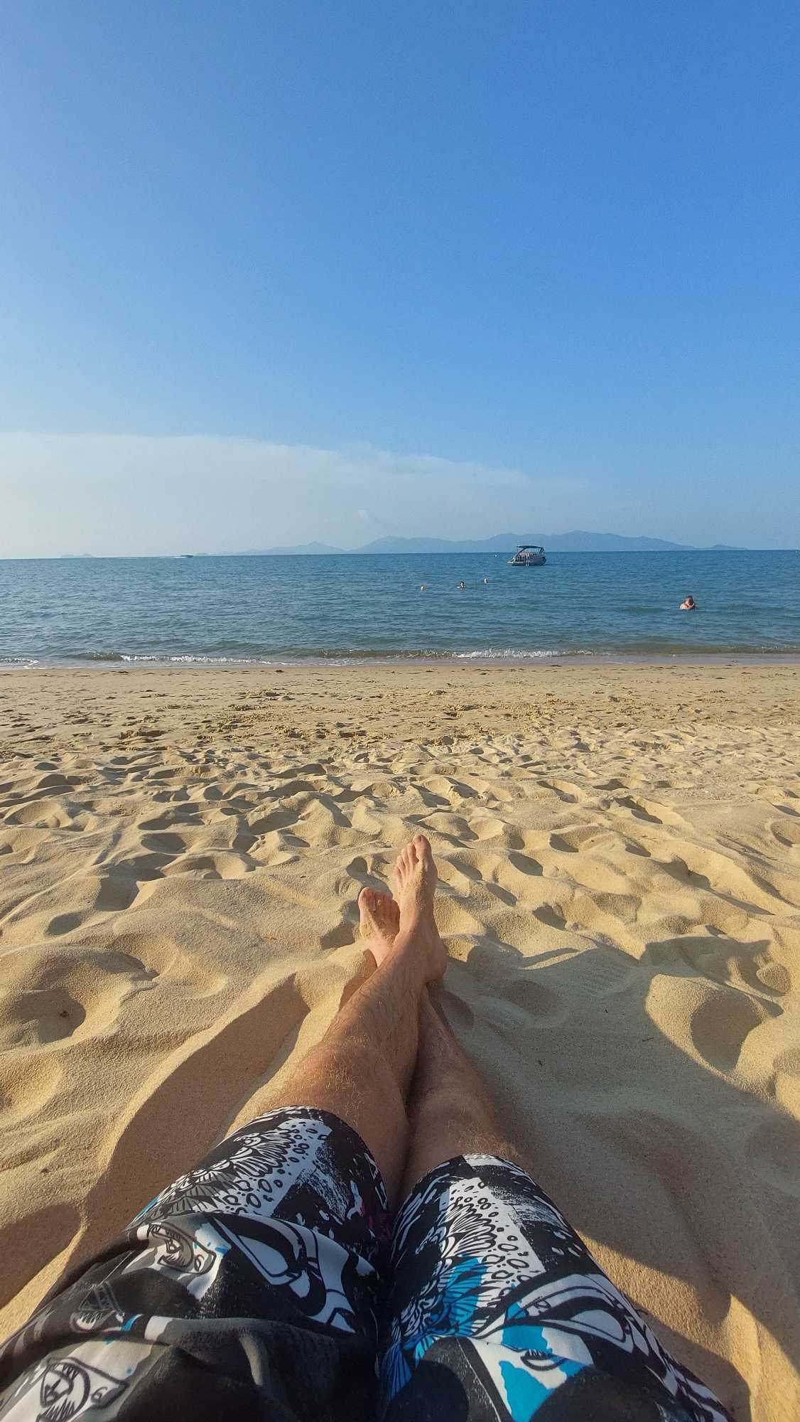This image captures a serene beach scene from a first-person perspective, with the viewer's legs and feet prominently in the foreground. The person is relaxing on golden, finely textured sand, wearing…read more