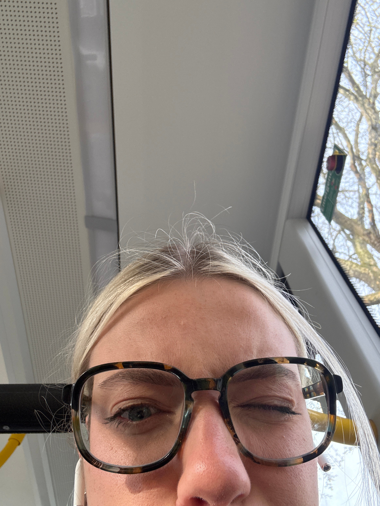 A close-up, tilted photograph shows a person with blonde hair and glasses on a bus. The person's face is close to the camera. The background includes a window, trees visible outside, and the interior…read more
