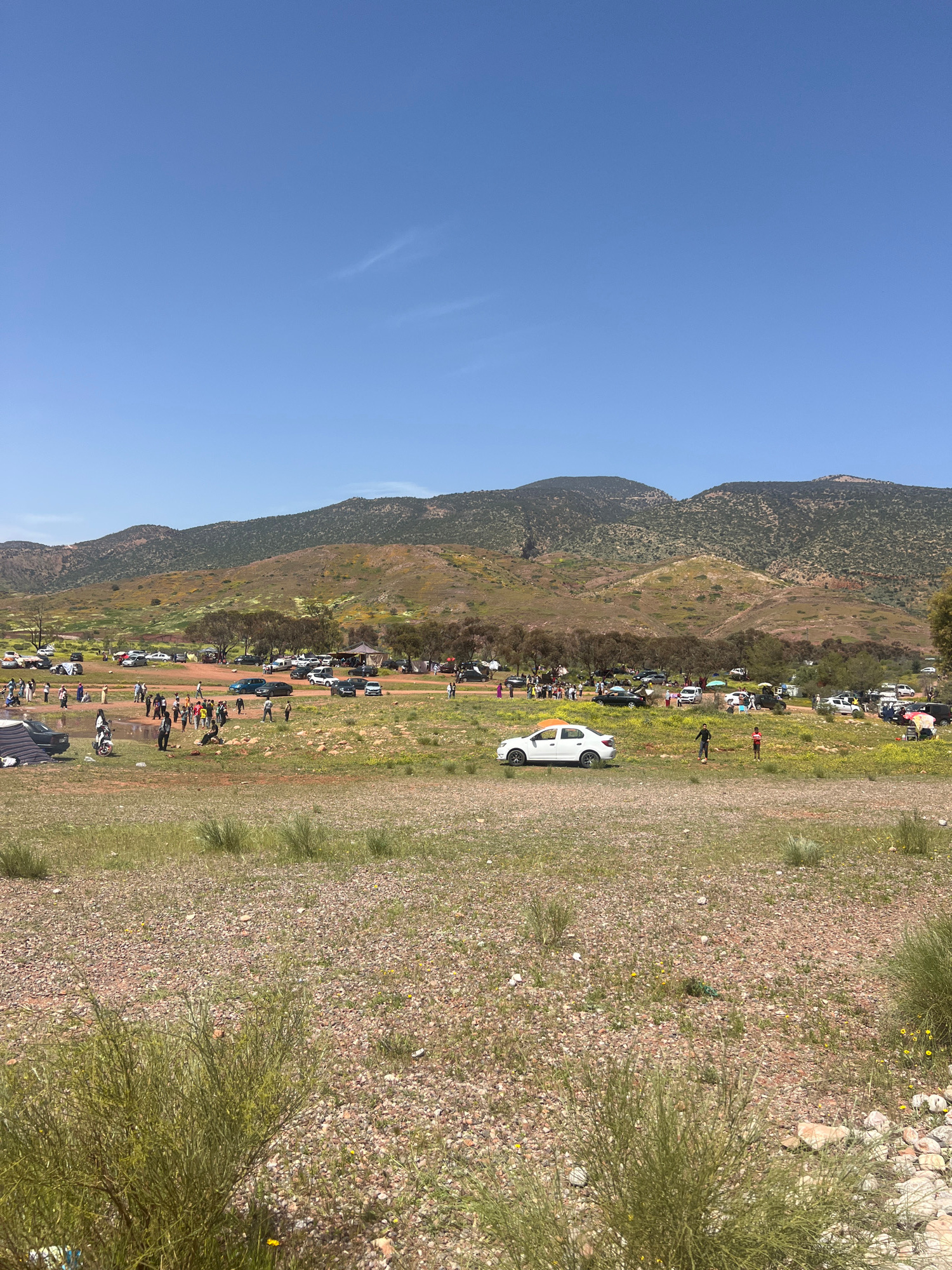 The image shows a gathering of people and cars in a semi-rural area near Bin El Ouidane, Morocco. The scene includes a mountainside in the background, a grassy area with scattered rocks, and a variety…read more