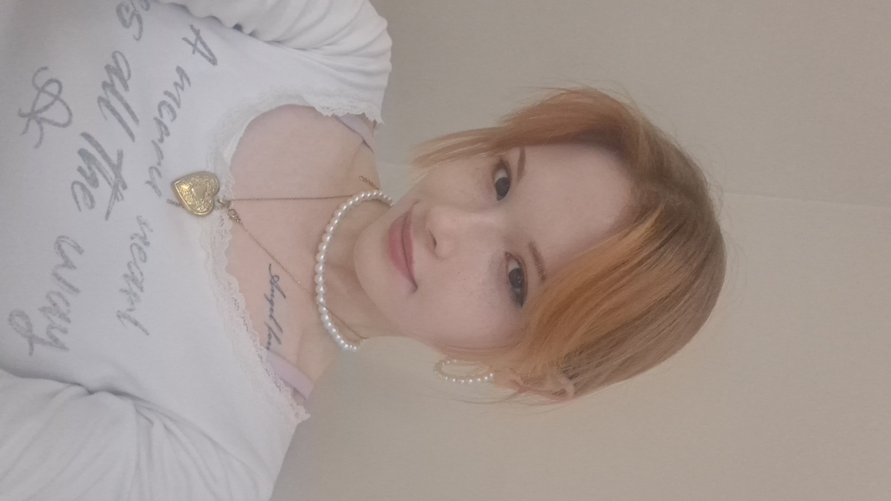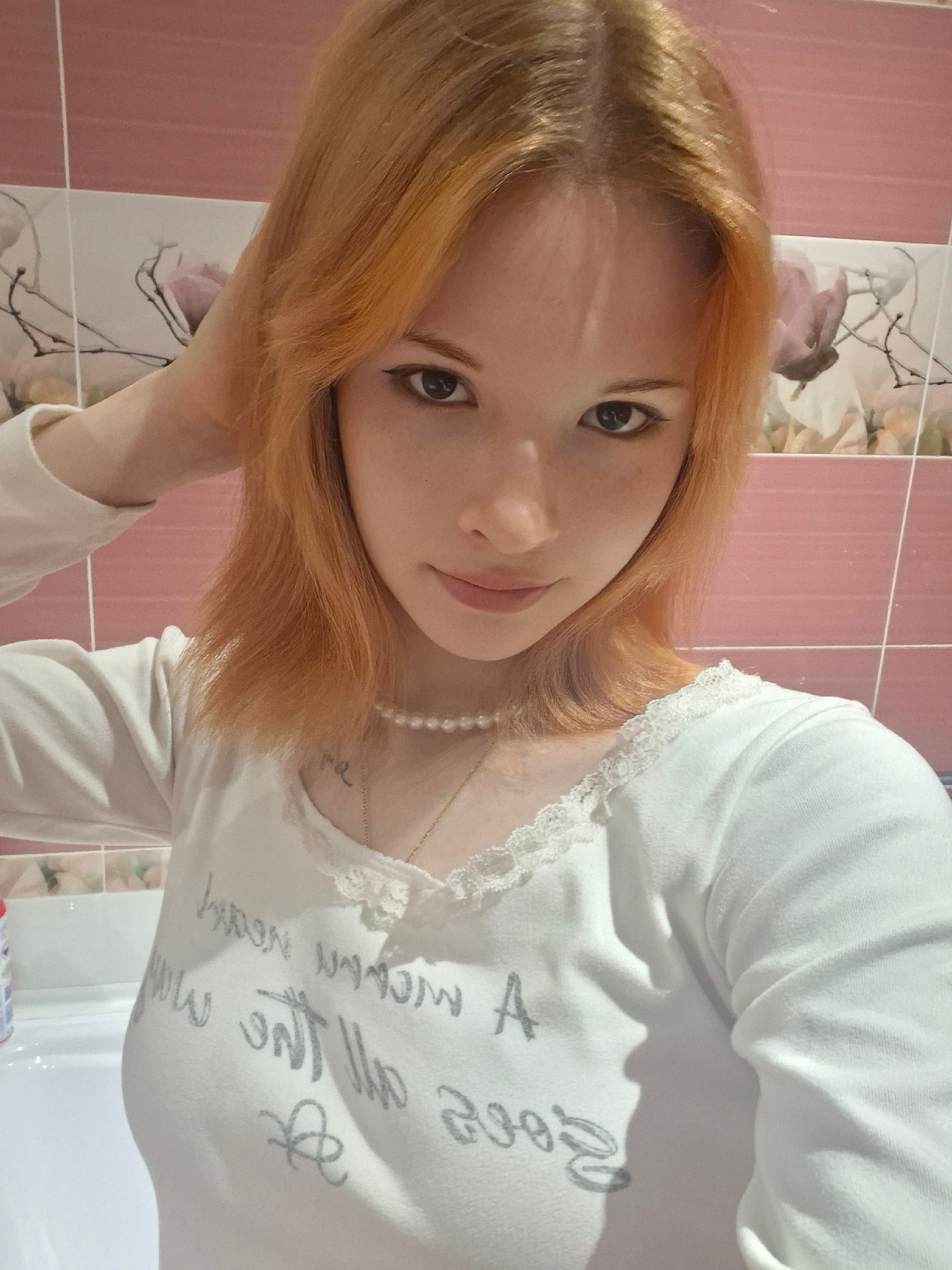 The image is a selfie of a fair-skinned woman with strawberry blonde hair, presumably indoors in a bathroom. She is wearing a white, long-sleeved shirt with lace trim around the collar, and a pearl ne…read more