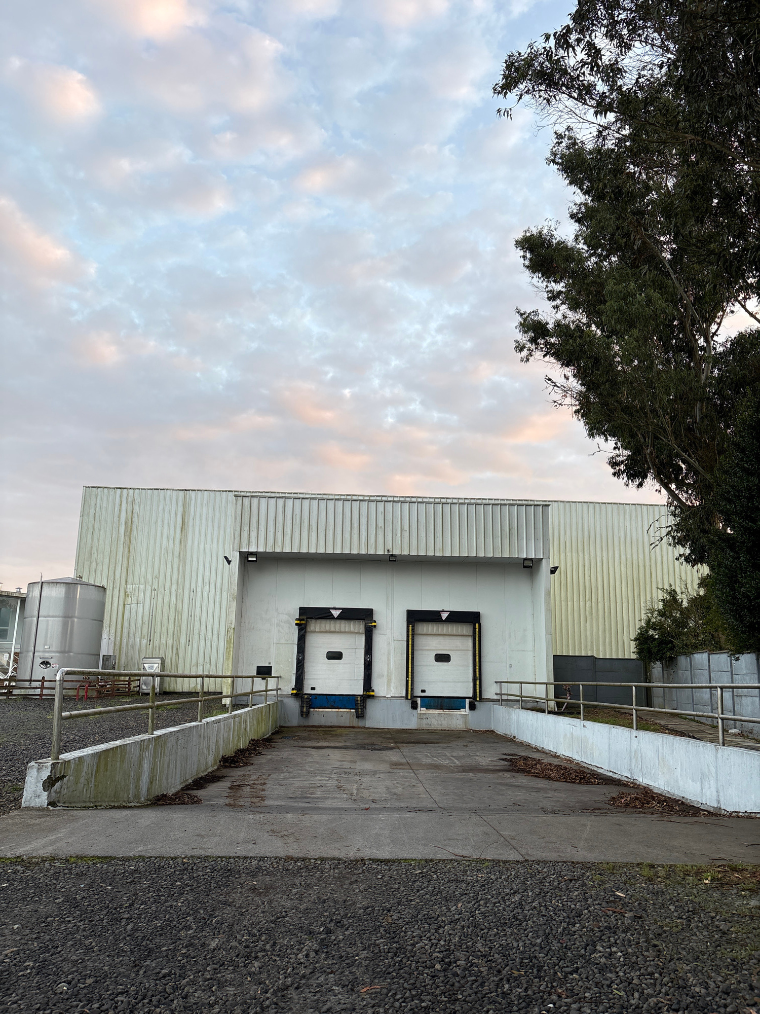 The image shows a warehouse-style building in Purranque, Chile. The building is light-colored, likely metal siding, and features two loading docks. A concrete ramp leads to the docks, bordered by a weathered guardrail. Gravel covers the ground to the right of the ramp. A tree's branches obscure the upper portion of the building and sky. The sky is overcast with mixed clouds of various tones. | Open Wire