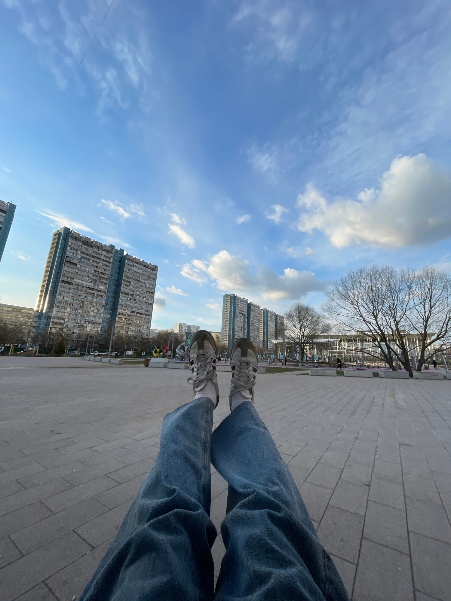 The image depicts a first-person perspective of someone sitting with their legs outstretched, wearing blue jeans and sneakers, in an urban environment. The ground is paved with rectangular gray stonesβ¦read more