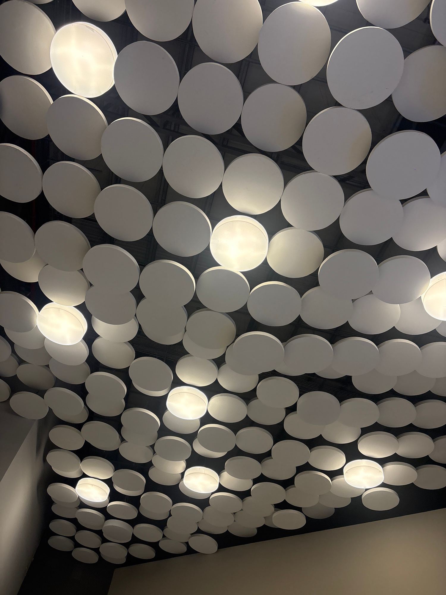 A wall of white, circular panels is angled on the right side. The panels are of varying sizes, with larger ones on the left. Lights are positioned within some panels, emitting a glow. The wall's surfa…read more