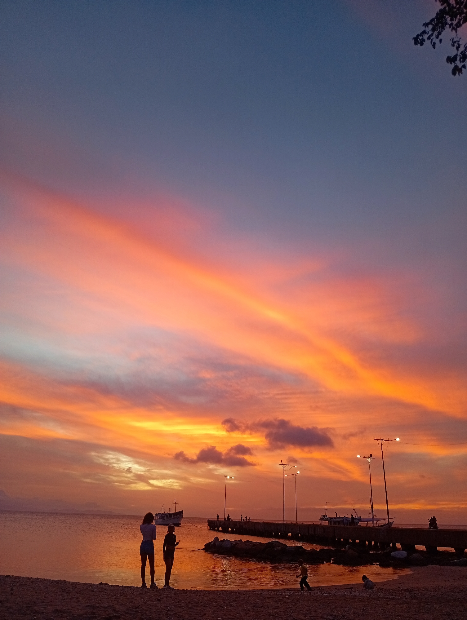 The image depicts a sunset scene over a coastal area in Juan Griego, Venezuela. The sky displays a vibrant gradient, transitioning from deep blue at the zenith to shades of purple, pink, orange, and g…read more