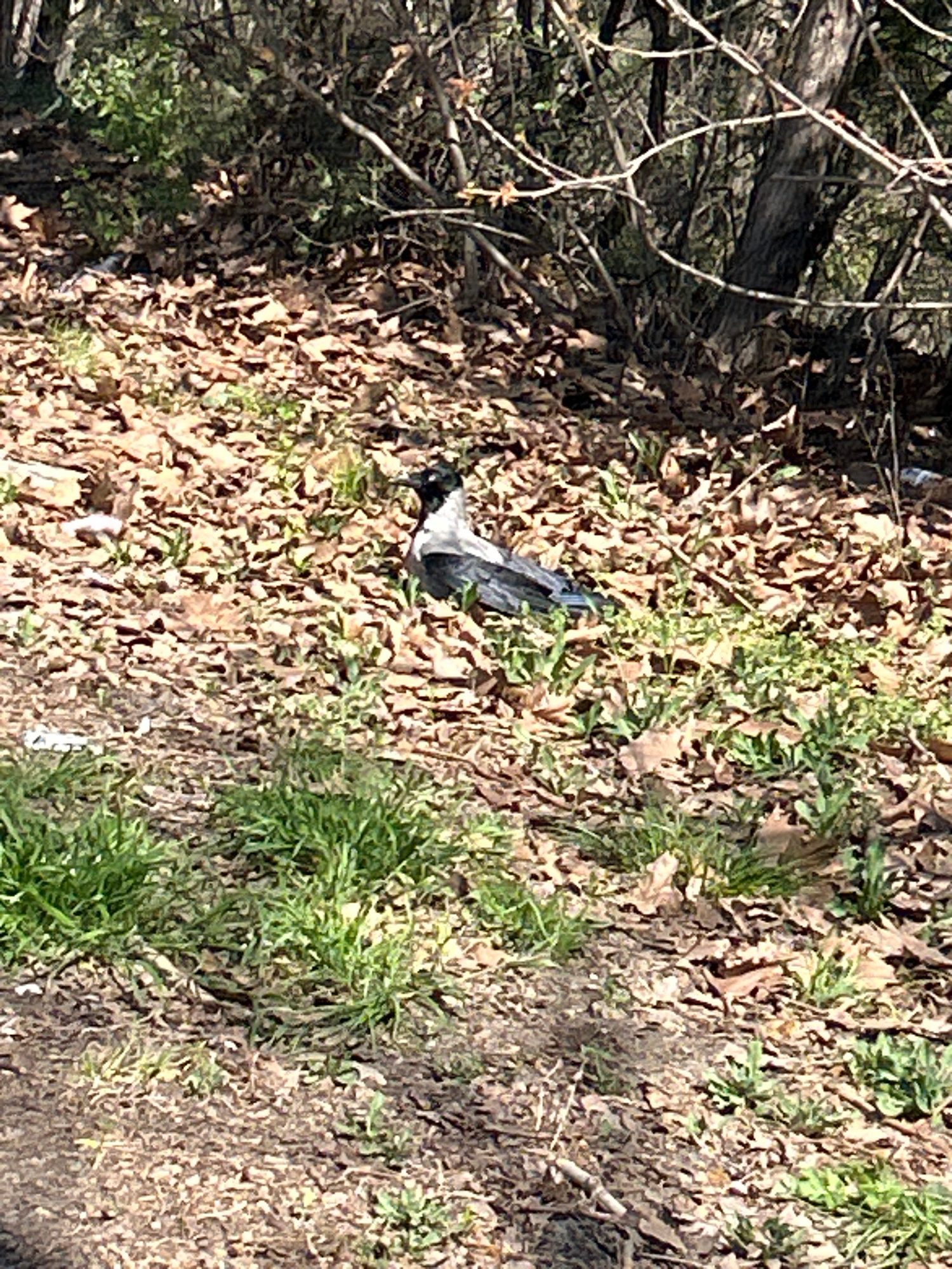 The image depicts a section of ground covered with dry leaves and some green vegetation, possibly in a wooded area. There is a discarded plastic bottle or container among the leaves. The left edge of…read more