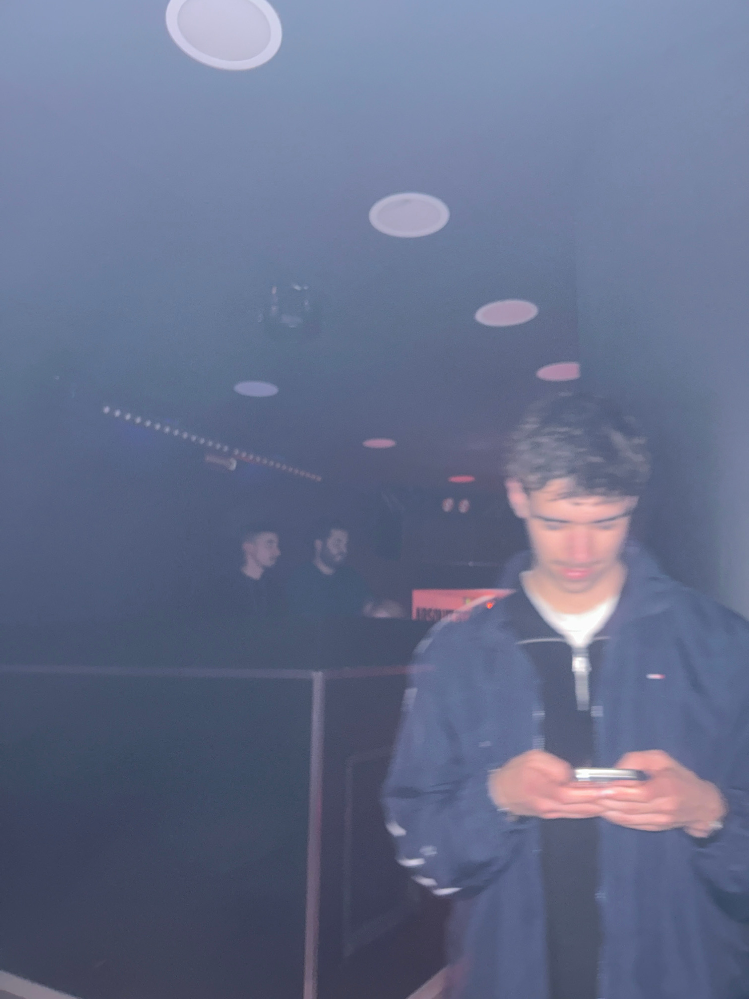 A slightly blurred image shows a young man holding a small object, possibly a phone, in a dimly lit interior. He wears a dark jacket over a white shirt. Other individuals are seen further back in the…read more