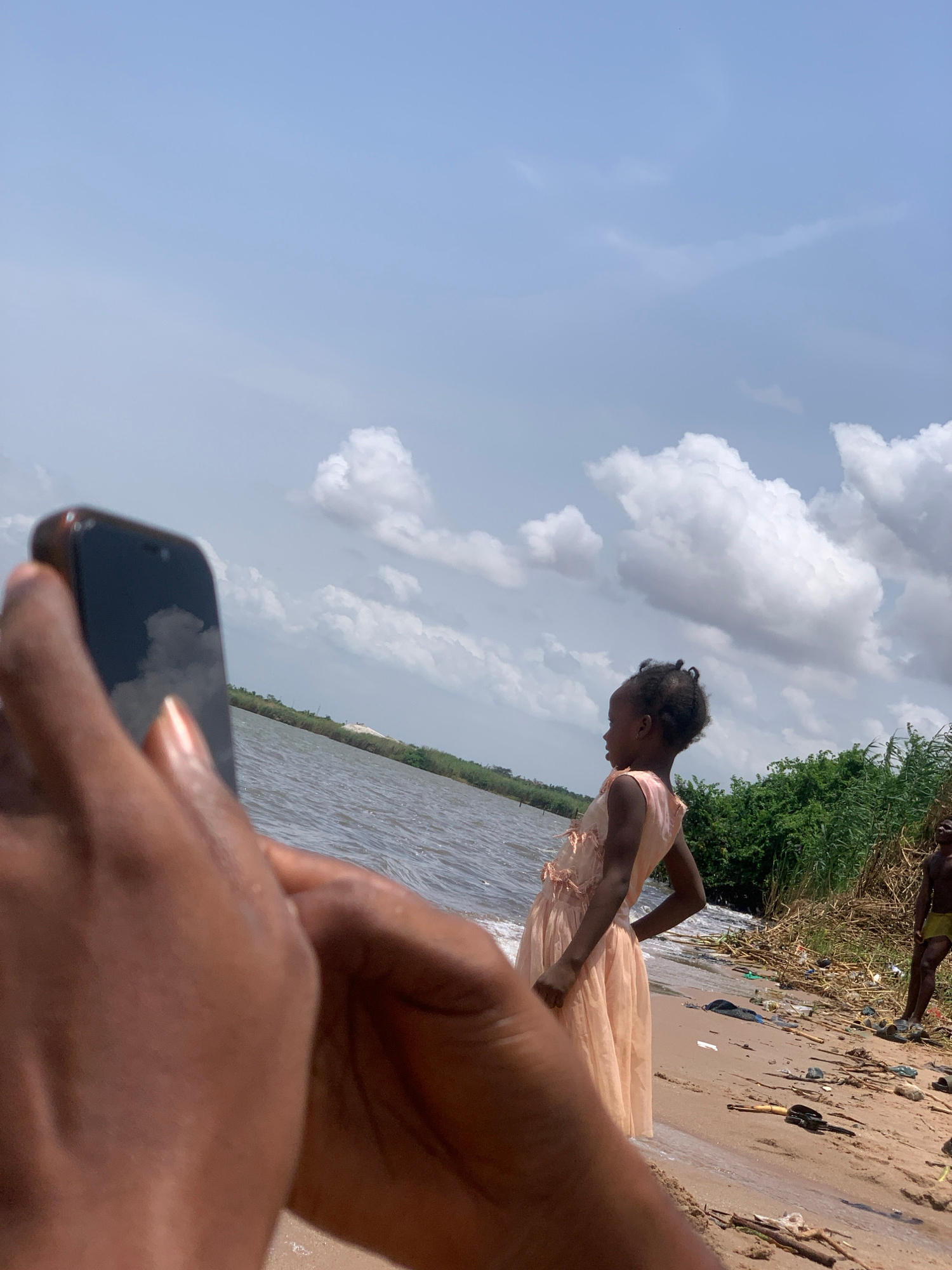 A person is holding a black smartphone while standing on a sandy beach in Ikorodu, Nigeria. The phone's screen reflects the sky and clouds. A young girl in a light-colored dress stands near the water'…read more