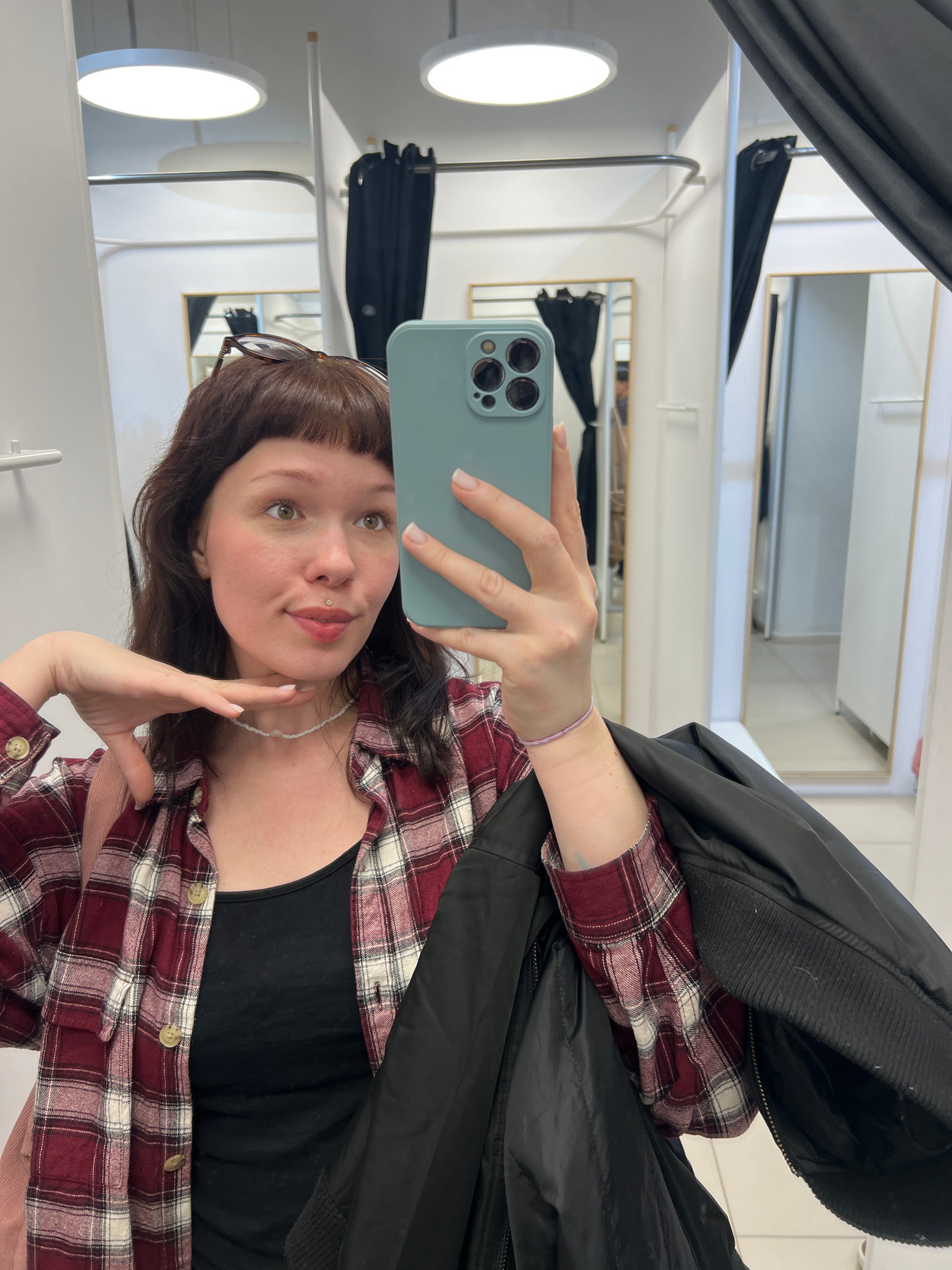 A young woman is captured in a mirror selfie, taken in what appears to be a fitting room in Izhevsk, Russia. The image is oriented with the subject's head tilted to the right, as if the original portr…read more