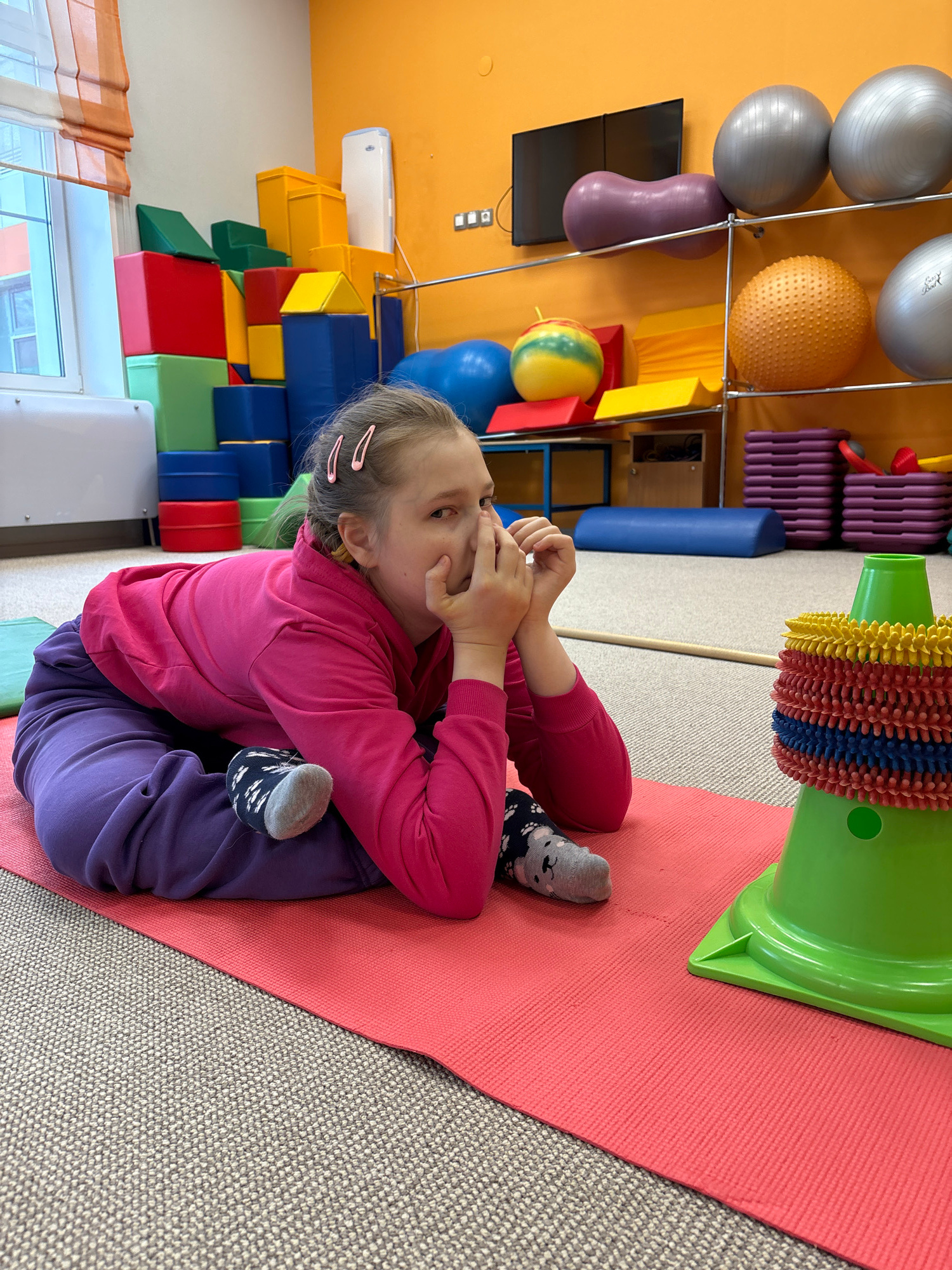 A young girl is pictured lying on a pink exercise mat in what appears to be a brightly colored therapy or activity room. She is positioned on her back with her knees bent and feet flat on the mat, wea…read more