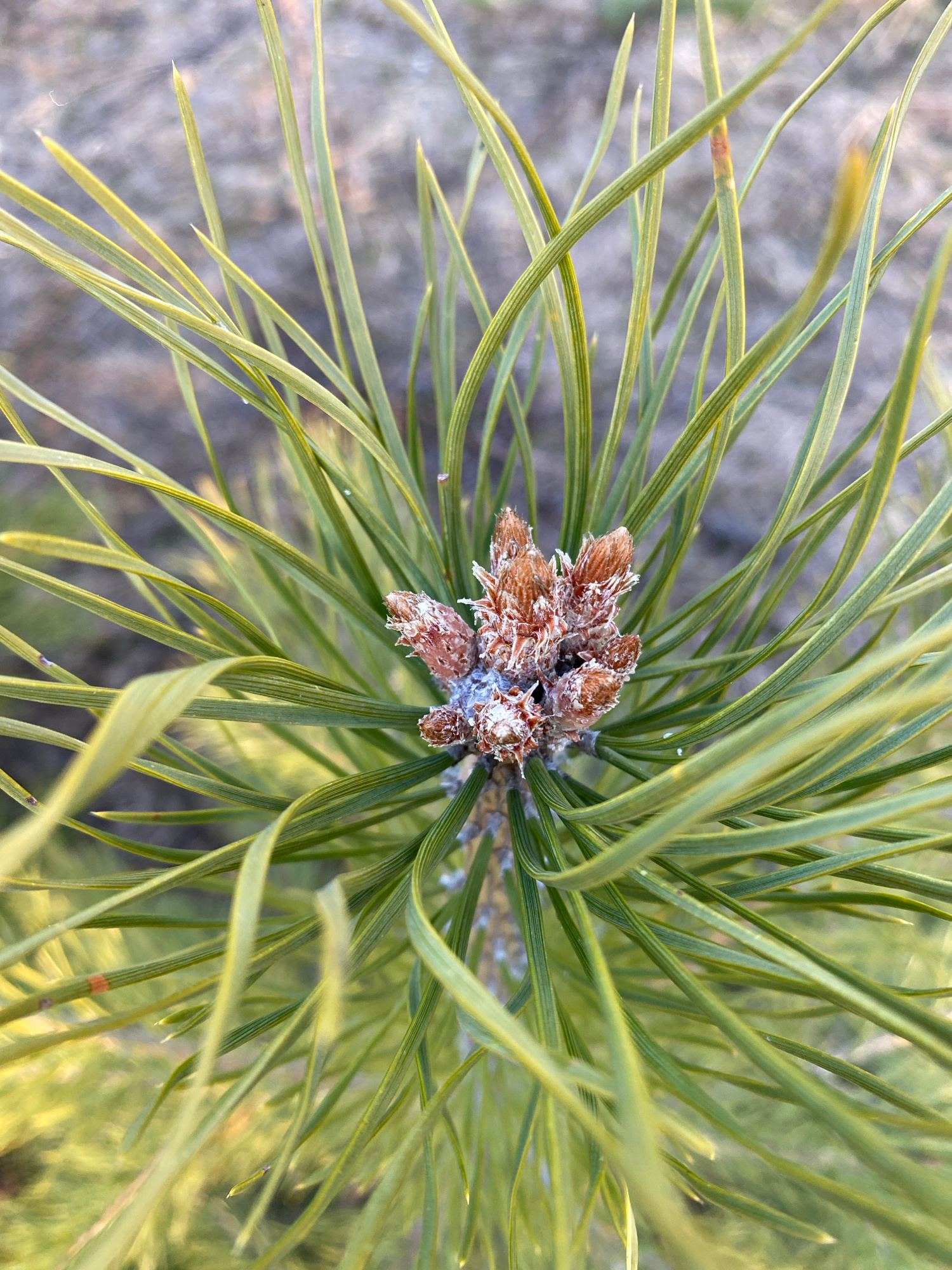 The image presents a close-up, top-down view of a conifer plant, likely a pine. The primary subjects are its long, slender green needles and a central cluster of small, brown, developing cones or buds…read more